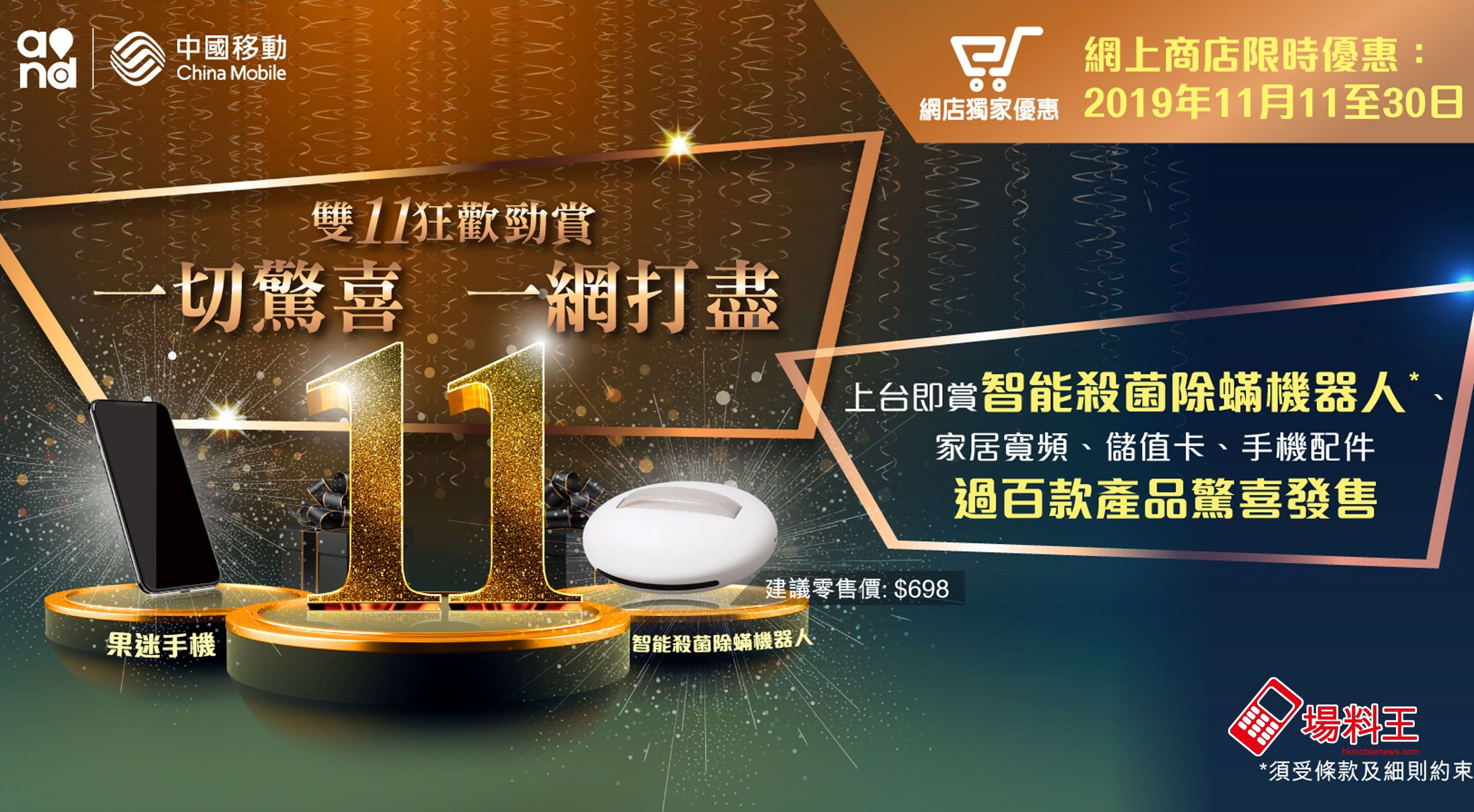 為迎接一年一度城中網購盛事,中國移動香港藉「雙11狂歡勁賞」,為新上台客戶帶來迎新大激賞。新客戶於中國移動香港網上商店登記選用「4.5G全速本地服務計劃」、「全速分享服務計劃」、「大灣區服務計劃」或「飛常全球通服務計劃」,並簽約24個月,即可獲贈迎新奬賞:「智能殺菌除蟎機器人」乙份(建議零售價$698),讓客戶既可以享用中國移動香港穩定可靠的高速網絡服務,同時體驗智能家居所帶來的便利。