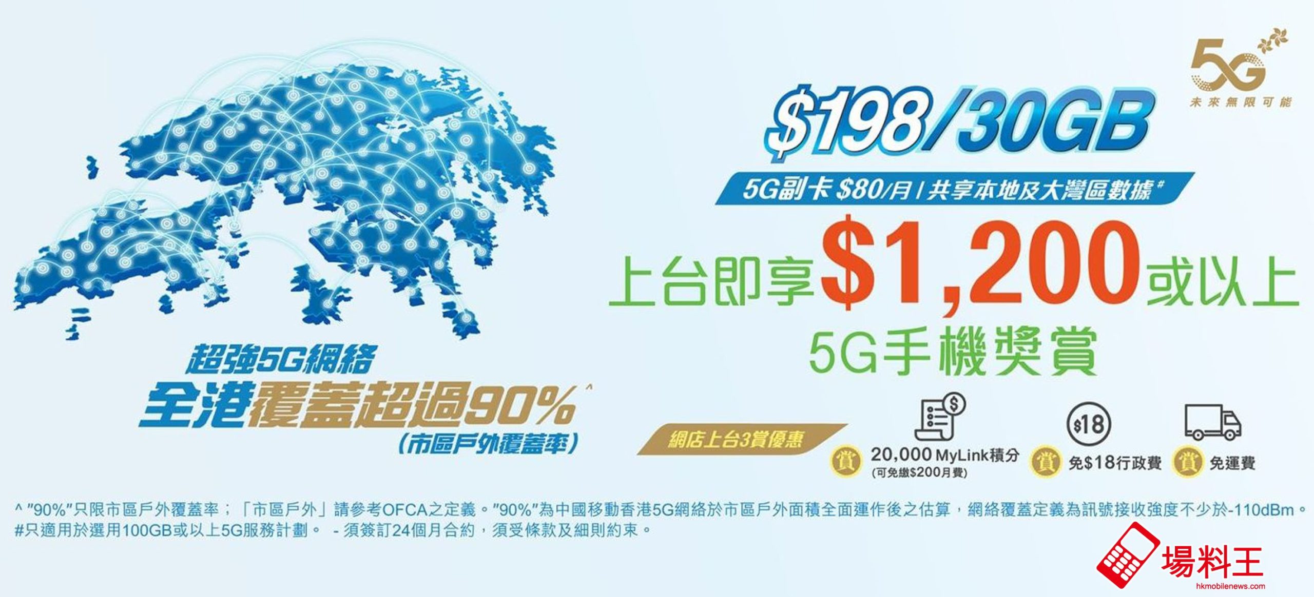 CMHK作為目前擁有最多5G頻譜資源的本地流動網絡營辦商之一,旗下5G網絡已覆蓋市區戶外超過90%。CMHK 5G網路速度快、覆蓋廣,5G服務計劃更是性價比極高,上台選用30GB 5G體驗計劃,月費只需$198*即可享$1,200手機獎賞^,另設100GB、200GB及300GB 高用量計劃,更可獲高達$2,700手機獎賞^。服務計劃亦包含高達20GB大灣區漫遊數據及高達500分鐘大灣區通話分鐘,並可於中國內地、香港及澳門免費任聽來電,全面滿足客戶跨境通訊需要。