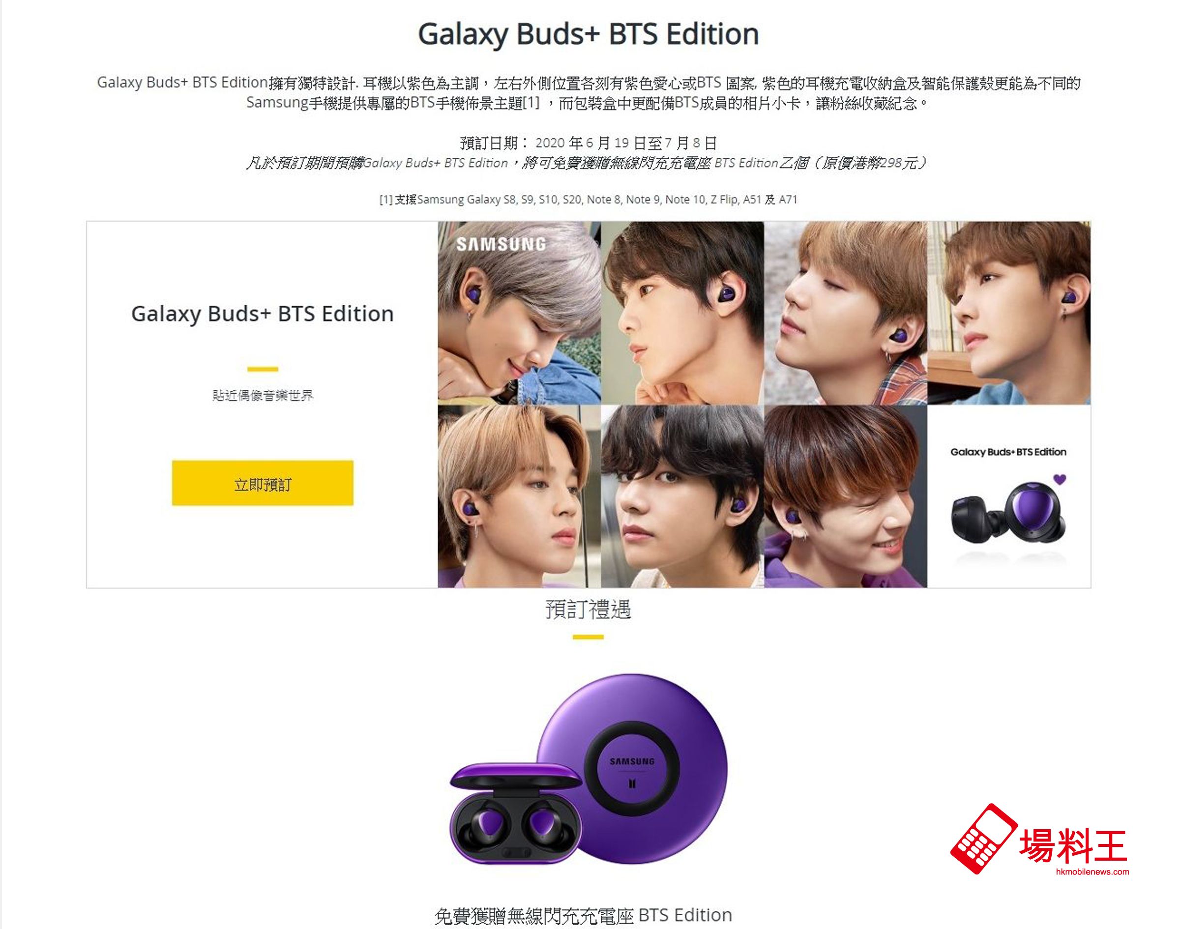 另「亞洲萬里通」生活品味獎勵平台更提供訂購 Galaxy Buds+ BTS Edition,而訂戶丟於 7 月 8 日前訂購更可免費獲贈無線閃充充電座 BTS Edition (原價 $298)。
