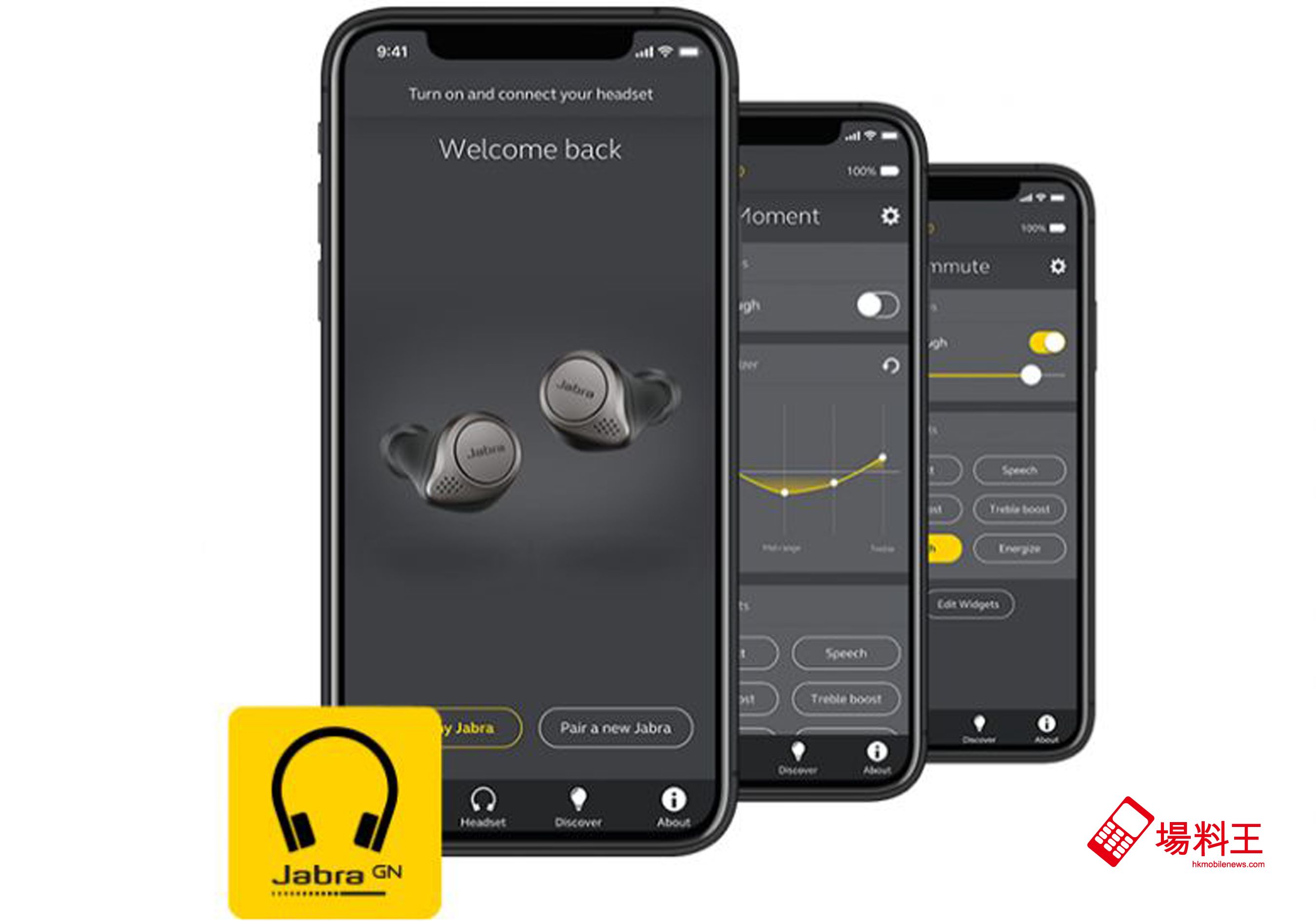 Jabra Sound+ 應用程式讓用戶自行選擇語音助手、自訂音樂均衡器、自設環境噪音收聽量(HearThrough)、調整通話體驗,及追蹤電池電量等。