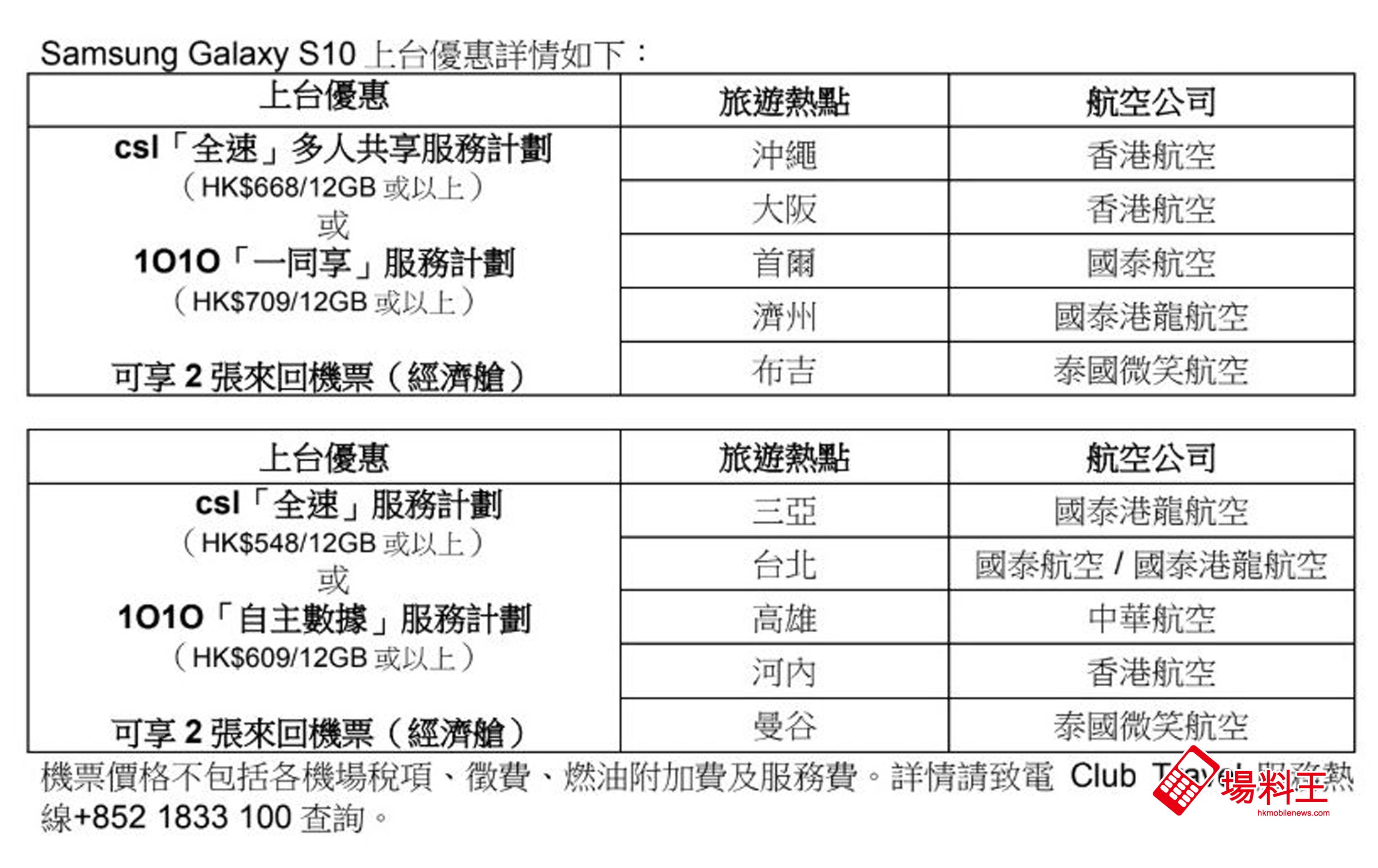 CSL Mobile 聯乘 Club Travel (旅行社牌照號碼:350873) 推出上台優惠,客戶於 3 月 8 日至 4 月 7 日的優惠期內,選購 Samsung Galaxy S10 系列智能手機並簽訂指定的 csl 或 1O1O 流動通訊服務計劃,便可獲贈雙人香港出發來回機票。機票將由 The Club Travel Services Limited 提供,客戶可於指定的 10 個旅遊熱點,包括大阪、沖繩、首爾、濟州、曼谷、布吉、河內、三亞、台北或高雄,任選其中一個目的地機票(經濟艙)。