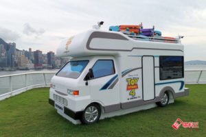 在海運觀點的右邊,則停放了仲夏露營車假期旅行車,上面更放有很多玩具角色,並可見到薯蛋頭先生及太太、綠色恐龍塑膠玩具抱抱龍、小豬造型塑膠錢箱的火腿。