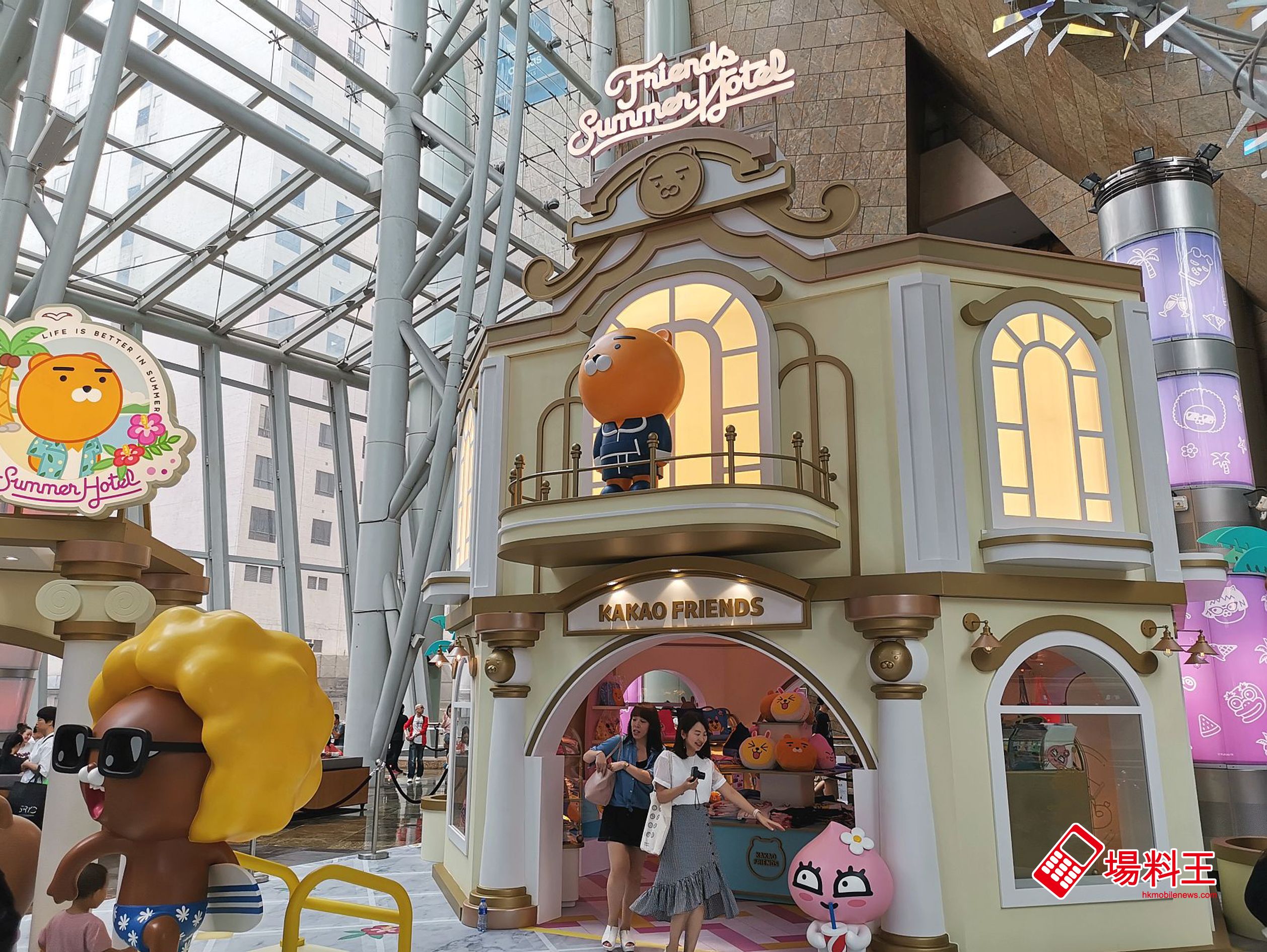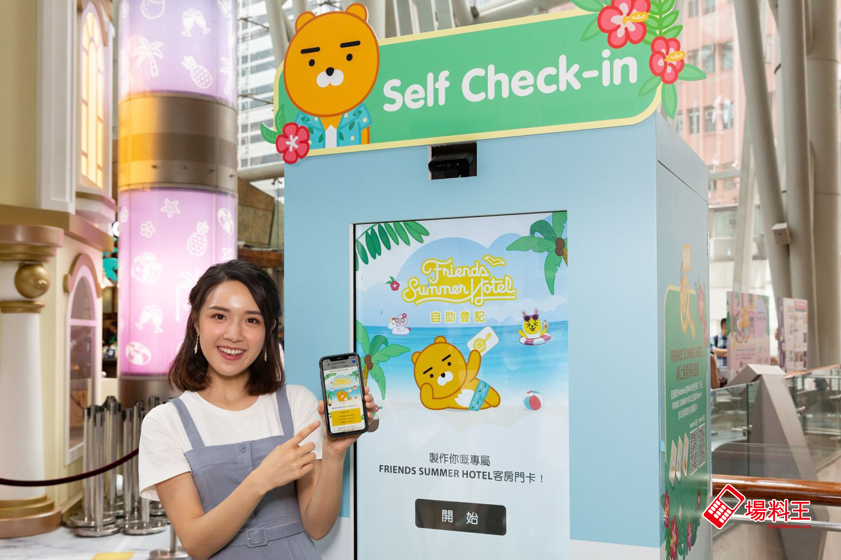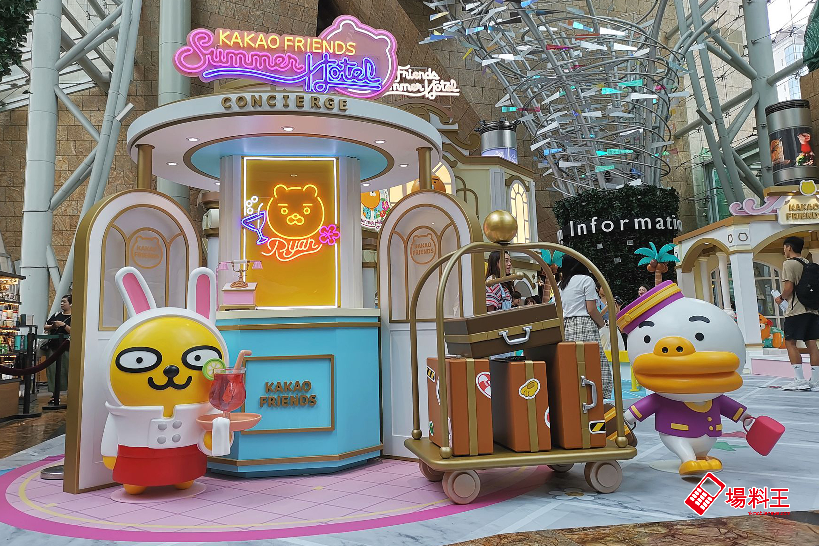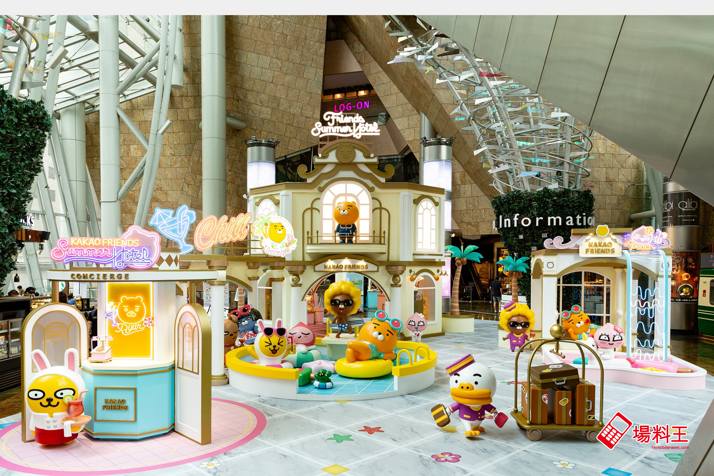 韓國火熱國民卡通人物 Kakao Friends 的「Friends Summer Hotel」由即日起至 9 月 1 日,在朗豪坊 4 樓通天廣場隆重開幕,由 Kakao Friends 親自「營運」,當中 8 位主角包括 Ryan、Apeach、Muzi、Con、Neo、Frodo、Tube 及 Jay-G,時而化身星級酒店職員為大家效勞,時而按捺不住盛夏渡假心情,換上泳衣沙灘裝,與眾同樂。