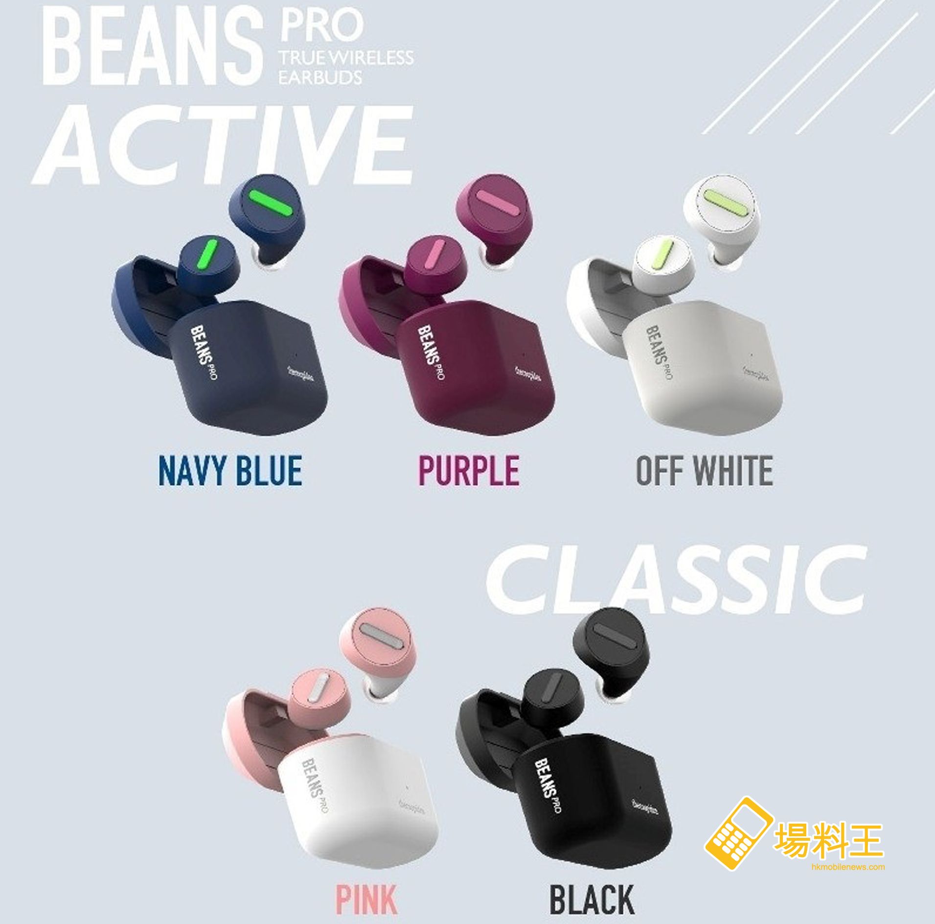 全新的 BEANS PRO ACTIVE 備有黑、粉紅、夜藍、煙幕紫及淬煉白五種顏色,建議零售價為 $899;現於指定店鋪 (LOG-ON、豐澤、CD Warehouse、Original) 選購 BEANS PRO ACTIVE,即送價值 $249 的瑜珈墊,送完即止。
