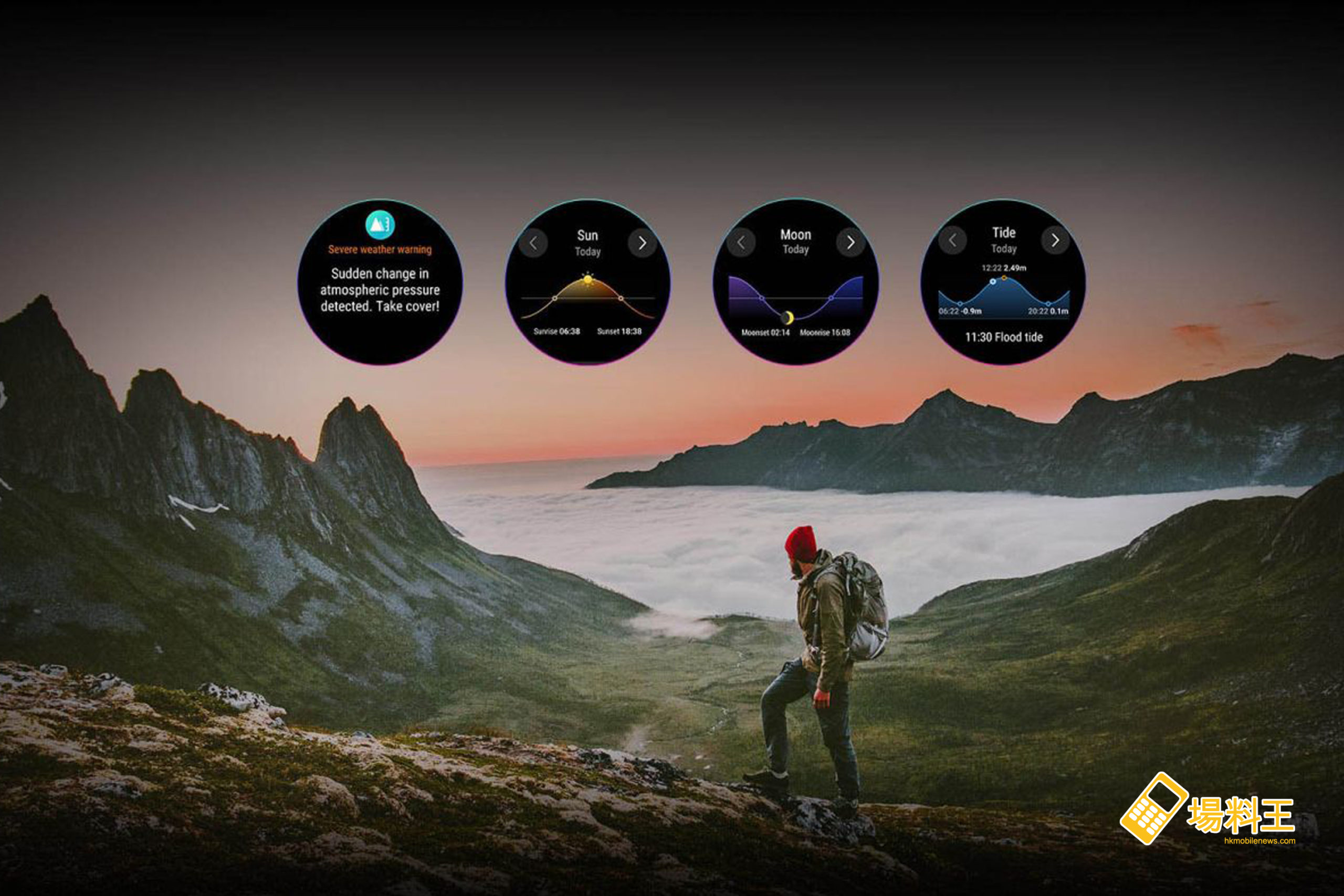 有關野外運動功能,GS Pro 在野外安全方面下了不少功夫,比如 GPS 定位功能,能夠自動記錄並選取可靠的 GPS 定位點,而且支持軌跡返航功能 (支援登山/徒步/越野跑/戶外步行/戶外跑步/戶外騎行模式),通過手錶獨立 GPS,快速返回起點,對經常登山或跑山用家十分有用。手錶還會在 GPS 信號弱的情況下通知用家 GPS 不可靠,能夠最大程度的有效保護用家在野外的行蹤安全。除了定位航線規劃之外,還有日出日落時間推算功能,能夠在離線的情況下根據最後一次當前位置推算當前的日出日落時間,而潮汐推送功能則為海邊遊玩用家提供安全資訊。比較特別的是 GS Pro 具有惡劣天氣預警功能,採用氣壓 AI 演算法,能夠預測惡劣天氣來臨,時刻提醒並保護用家的安全。