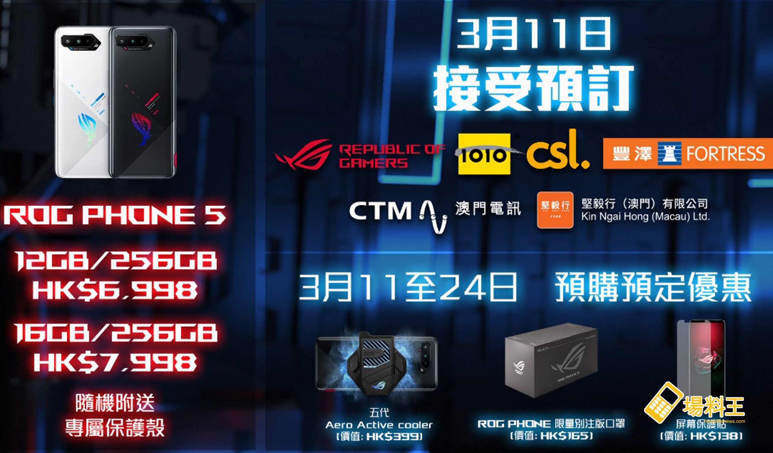 ROG Phone 5 12G/256G 版本及16G/256G版本(幻影黑 / 極光白)建議零售價為 $6,998及 $7,998,隨機附送「Aero 專屬保護殼」,3月11日起於 ROG Pro Shop、1O1O、csl、豐澤、澳門電訊及堅毅行(澳門) 正式接受預訂;3月24日前預訂 ROG Phone 5 即送 ROG 空氣動力風扇 5、螢幕保護貼及 ROG Phone x MaskOn 限量別注版口罩。