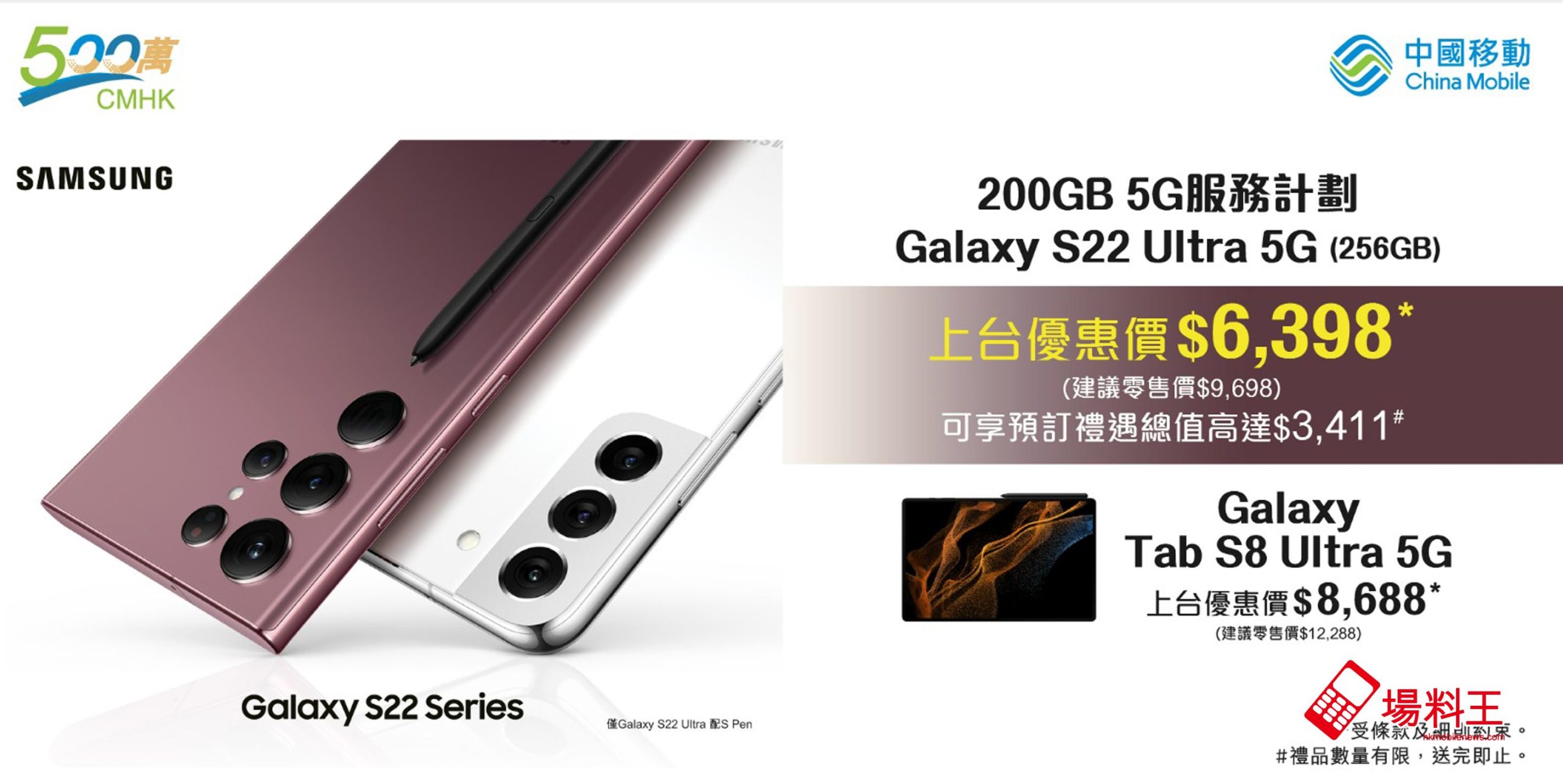 Samsung 全新旗艦級 Galaxy S22 5G 系列即將強勢登場,CMHK 特別呈獻一系列預訂出機優惠及限定禮遇,由即日起至 3 月 3 日預訂 Galaxy S22 Ultra 5G (256GB) (建議零售價 $9,698),並選用 5G 服務計劃 200GB,即享上台優惠價 $6,398 出機,折扣高達 $3,300,更可獲贈 Galaxy Buds Pro 智能降噪耳機(建議零售價 $1,698)、矽膠薄型背蓋(附指環帶,建議零售價 $328)、inno3C i-MAX78W 5-Ports 智能充電器(建議零售價 $499)、幸運盒指環帶(建議零售價 $198)、玻璃保護貼及透明手機保護套(建議零售價 $188)及 $500 Trade-in 額外回贈,尊享禮遇高達 $3,411,讓客戶搶先以最完善配套擁抱由 CMHK 與 Samsung 激發的 5G 絕配組合。