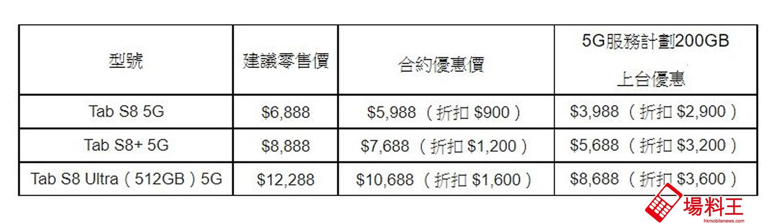 上台客戶選用 5G 服務計劃 200GB,亦可同時享 $8,688 出機價,即時預訂 Galaxy Tab S8 Ultra 5G(512GB)(建議零售價 $12,288),折扣優惠達 $3,600,並可享總值近 $3,000 預訂禮品,包括原廠書本式鍵盤保護套(建議零售價 $1,999)、inno3C i-MAX78W 5-Ports 智能充電器(建議零售價 $499)及 $500 Trade-in 額外回贈,輕鬆入手最新規格 5G 旗艦平板電腦,火速享受非凡 5G 智慧生活。