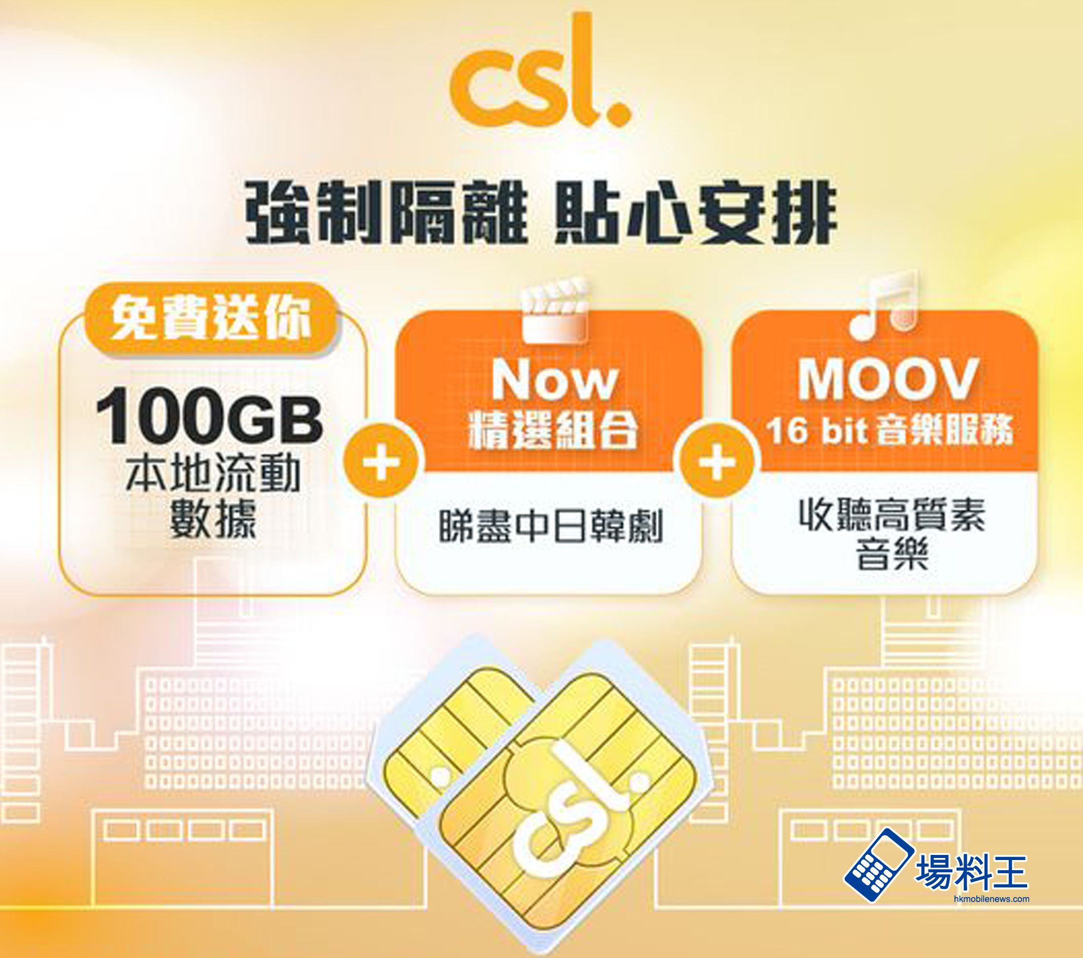由疫情至今,csl 及 1O1O 客戶如緊急需要入住政府指定檢疫中心或酒店,香港電訊已送上 100GB 本地流動數據(30 日內有效)、免費 Now 精選組合,及免費 MOOV16 bit 音樂服務,陪伴隔離人士渡過疫情。