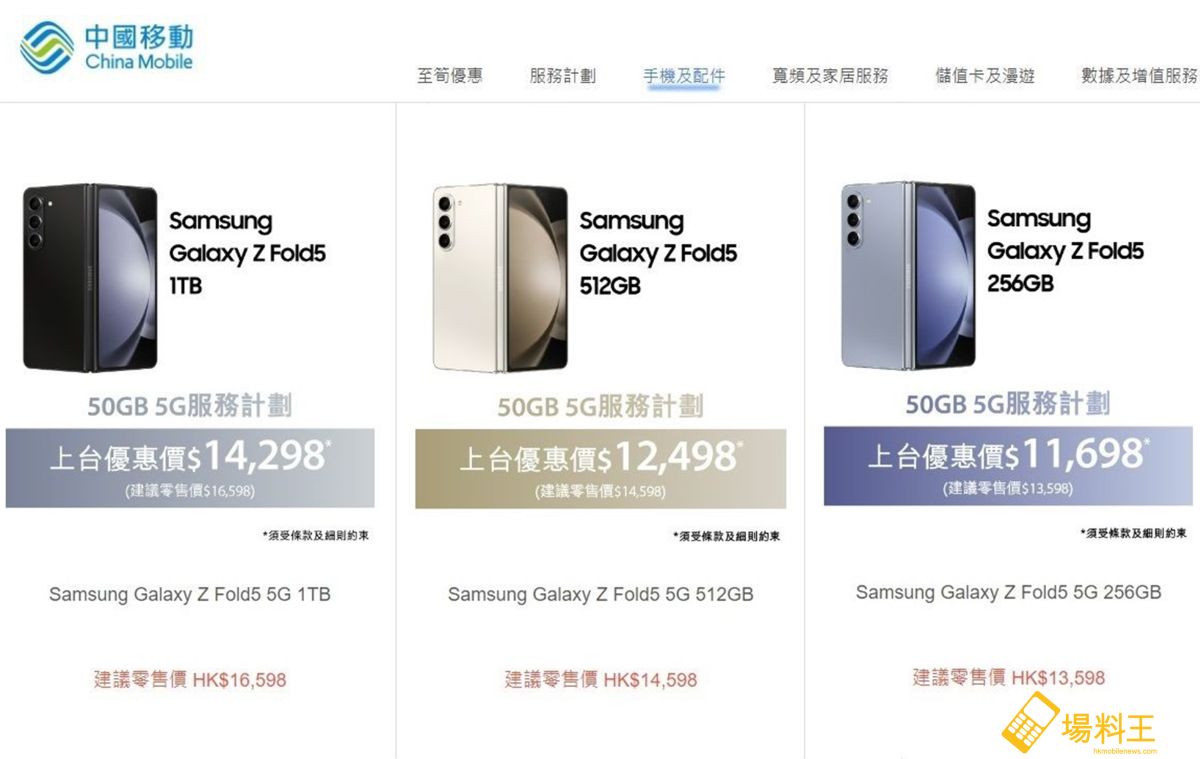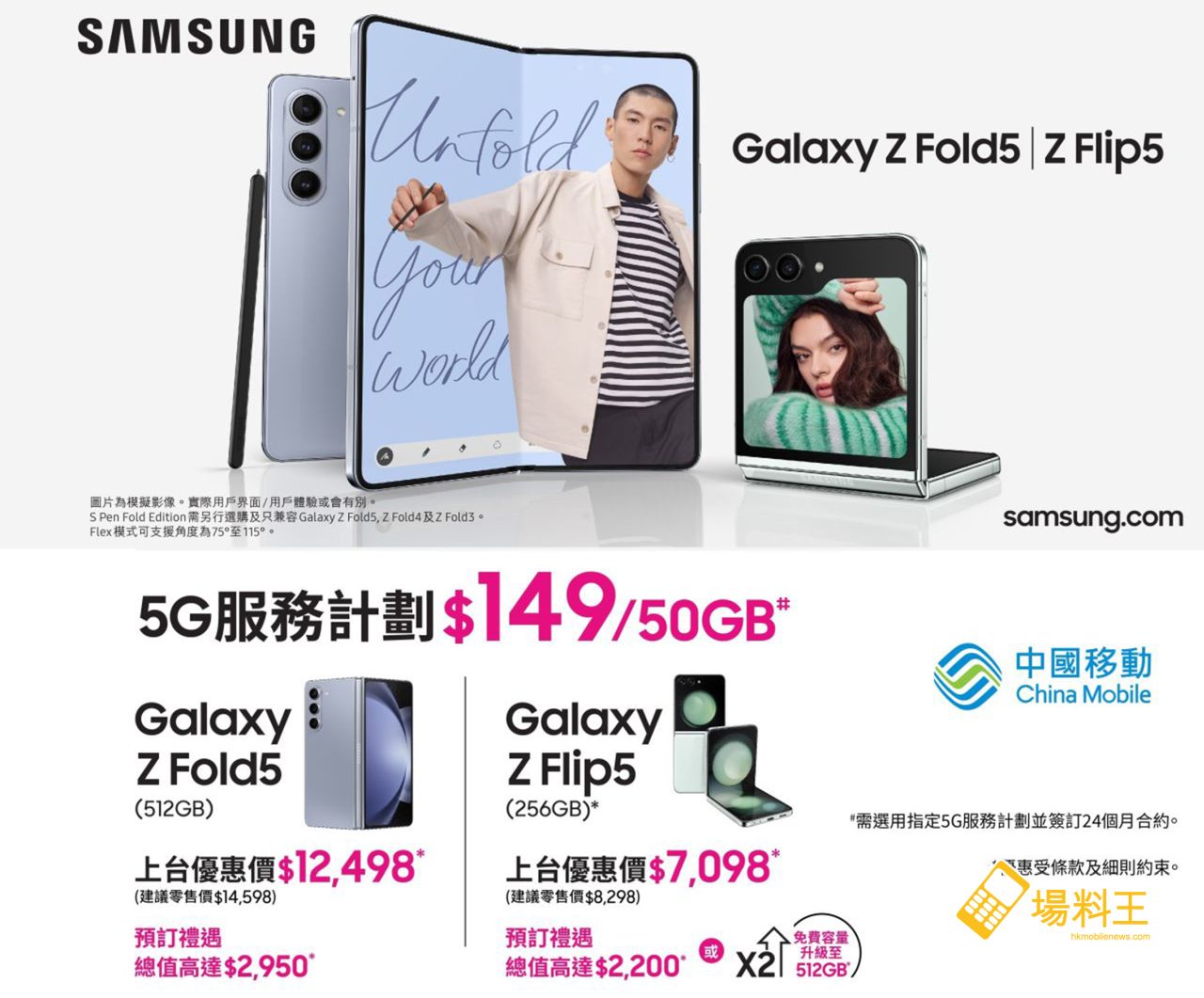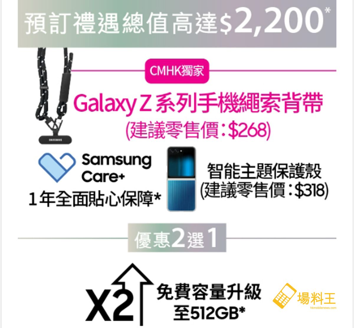 隨著全新旗艦摺機 Galaxy Z 系列即將強勢登場,CMHK 特別呈獻預訂優惠與豐厚禮遇回饋新舊用戶,即日起預訂 256GB Galaxy Z Flip5,並選用月費 $149 50GB 或以上 5G 服務計劃及簽約 24 個月,可選擇「免費容量升級」升級至 512GB 容量型號,折扣優惠達 $2,200;或選擇 256GB 容量,搭配總值高達 $2,200 精彩禮遇出機,讓客戶搶先以最完善配套擁抱由 CMHK 與 Samsung 激發的 5G 絕配組合,享受世界級的流動通訊體驗。