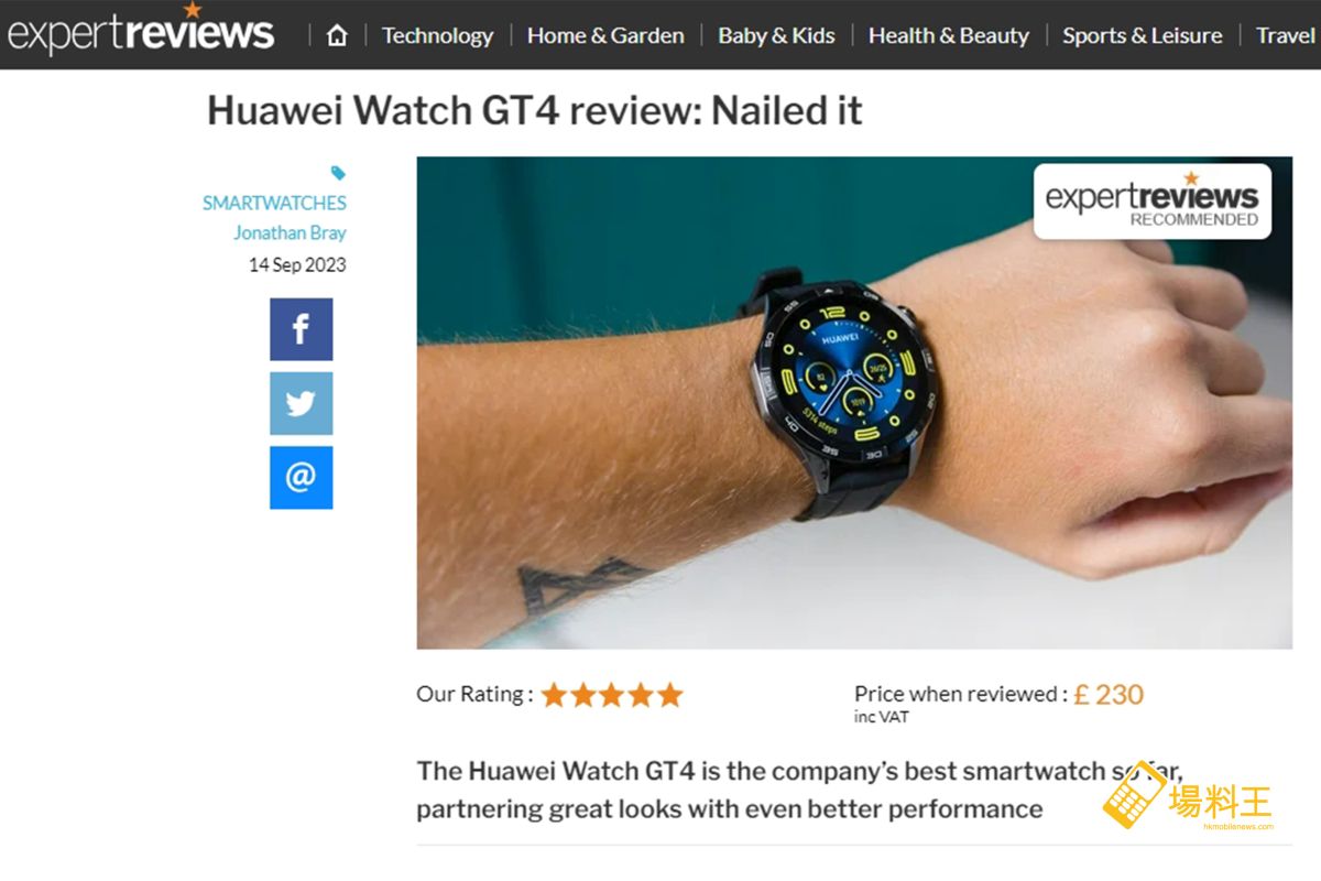 截至目前,HUAWEI WATCH GT 4 系列已榮獲全球頂級媒體頒發的 5 項獎項。當中包括 Expert Reviews 的 5 星頂級推薦 (下圖),並指出 HUAWEI WATCH GT 4 其準確度造就其出色效能;Android Authority 的 4 星推薦,不僅有充滿特色的外觀設計,其電池續航、健康監測成就了 HUAWEI WATCH GT 4,並成為,迄今最全面的智能手錶。