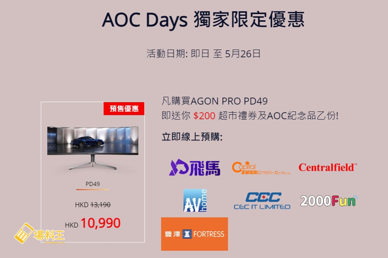 AOC Porsche Design AGON PRO PD49 顯示器已於 AOC Days 限定優惠期 5 月 26 日前接受預售,預售優惠價為 $10,990 (建議零售價為 $13,190),更加送 $200 超市禮劵及 AOC 紀念品一份,送完即止。