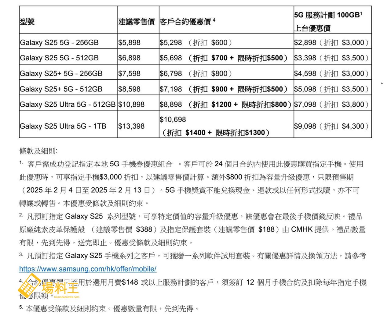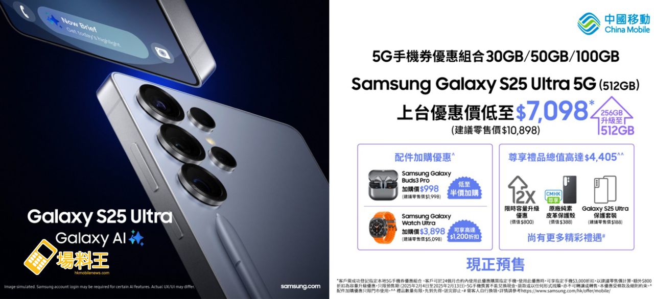 年度注目的全新旗艦手機 Galaxy S25系列將強勢登場,CMHK特別呈獻預訂出機優惠及限定禮遇。由即日起至 2 月 13 日預訂 Galaxy S25 Ultra 5G (512GB)(建議零售價 $10,898),並選用 5G 手機券優惠組合 100GB,即享上台優惠價 $7,098 出機客戶更可獲豁免 $18 行政費,並可獲合共 $4,405 的豐厚禮遇,包括手機容量升級優惠 (256GB 升級 512GB 價值 $800)、原廠純素皮革保護殼 (建議零售價 $388),以及 Galaxy S25 Ultra 保護套裝(建議零售價 $188),同時更可享一系列軟件試用優惠包括 ArcSite 一個月免費試用(價值 $1,158)、AI Mirror 三個月試用優惠與 3 次 AI Video 試用(價值 $484)、6 個月 Clip Studio Paint EX 免費試用(價值 $408)、Galaxy Store 禮品卡及遊戲券(價值 $550)、YouTube Premium 三個月試用優惠(價值 $234)、LumaFusion 半價折扣優惠(價值 $117)及 Adobe Lightroom 兩個月試用優惠(價值 $78),務求讓客戶以全面配套擁抱 CMHK 與 Samsung 攜手帶來的 5G 絕配組合,享受嶄新 AI 生活體驗。