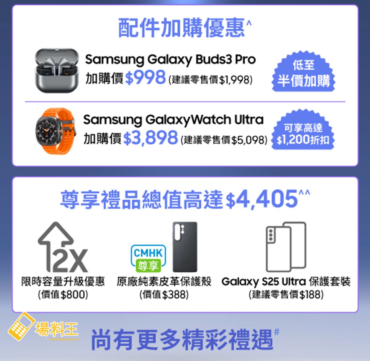 除了炙手可熱的旗艦手機 Galaxy S25 系列,CMHK 也同時帶來兩款 Samsung 時尚潮物,全面豐富用家數碼生活體驗。凡於 CMHK 選購 Galaxy S25 系列旗艦手機,均可以 $3,898 加購 Samsung Galaxy Watch Ultra (建議零售價 $5,098);或以$998加購Galaxy Buds3 Pro(建議零售價 $1,998),兩者加購折扣優惠共高達 $2,200。