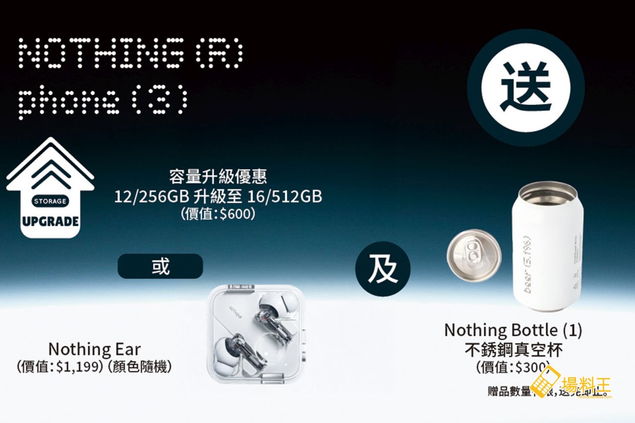 Nothing Phone (3) 提供黑、白兩色機身版本,記憶體容量為 12+256GB、16+512GB,售價為 $6,399、$6,999。產品將於 7 月 15 日公開發售,而預訂產品者免費可獲 Nothing Bottle (1) 不銹鋼真空杯(價值 $300),及 12/256GB 免費容量升級至 16/512GB(價值 $600)或獲贈 Nothing Ear(價值 $1,199)。