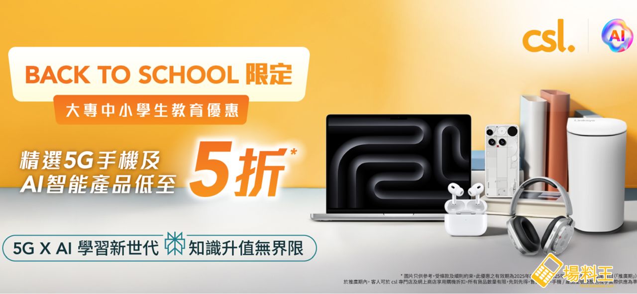 由即日起至 9 月 30 日,全線 csl 及 1O1O AI Store 及網上商店推出「Back to School 開學優惠」,大專及中小學生可享逾千件 AI 產品、Apple 產品、5G 手機及平板電腦低至半價優惠。