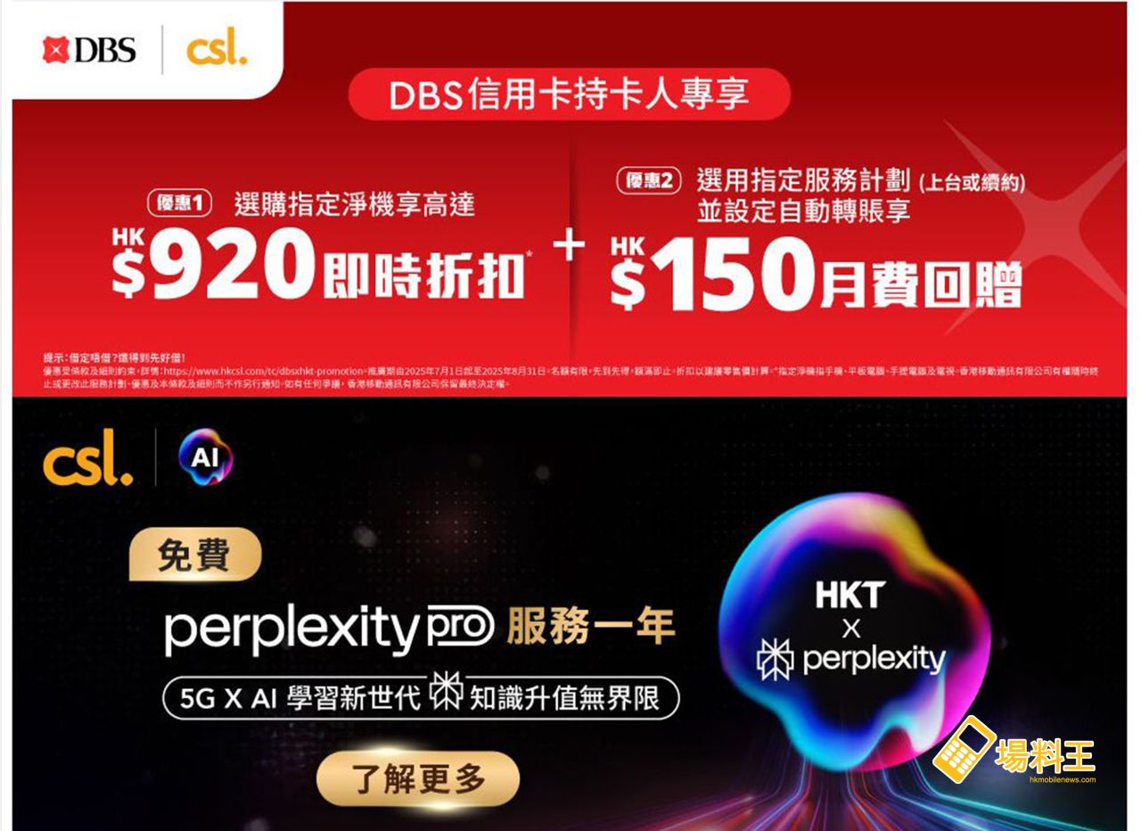 凡選購指定淨機產品,更可獲贈 Perplexity Pro 進階 AI 服務一年 (價值 $1,488)。此外,由即日起至 8 月 31 日,DBS 信用卡持卡人於 csl 及 1O1O AI Store 選購指定淨機產品可享高達 $920 即時折扣。