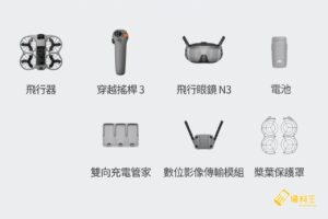 DJI Neo 2 暢飛套裝售價 $2,789,包含飛行器、數位影像傳輸模組、RC-N3 遙控器、3 顆智慧飛行電池、雙向充電管家等更多組件;