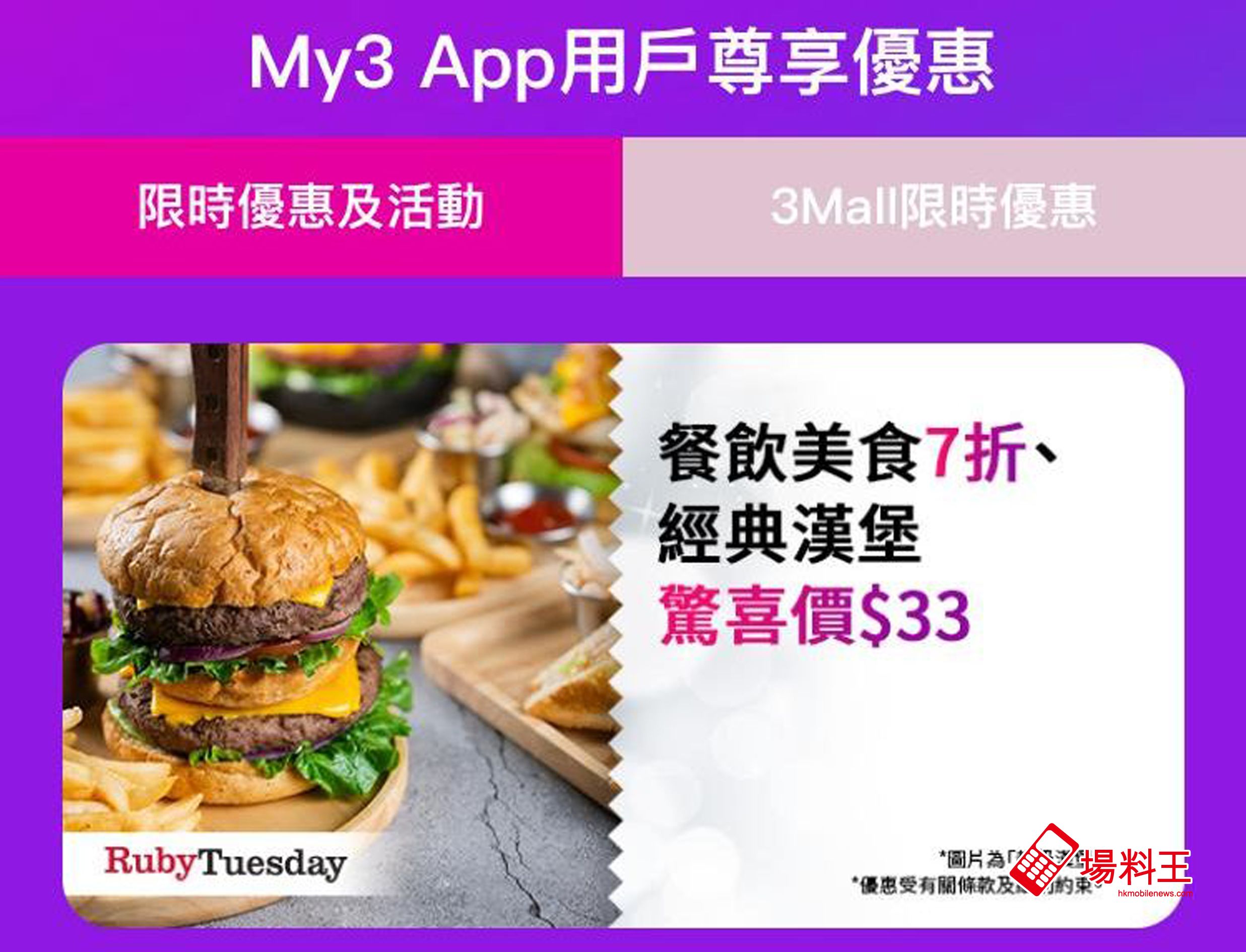 所有 3 香港客戶於 My3 App 內按 3Rewards 獲取指定優惠碼,並於光顧 Ruby Tuesday 時出示,即可享主餐牌餐飲美食 7 折優惠(酒精類飲品、套餐及每月精選除外),於 4月 30 日前更可以驚喜價 $33,享用原價 $178 的經典芝士漢堡一份,於 5 月 1 日則會公佈另一免費神秘經典美食,請密切留意 My3 App 內的最新消息。