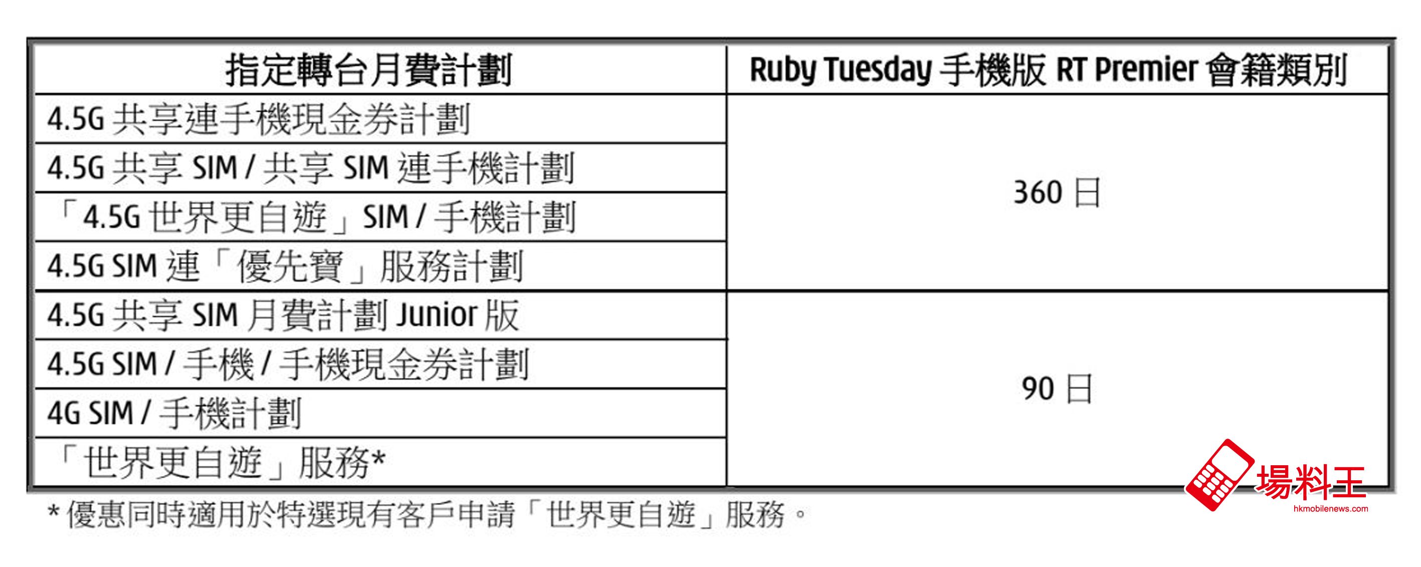 即日起到 5 月 31 日前,新轉台及特選現有客戶選用指定月費計劃,如 4.5G 共享連手機現金券計劃、4.5G 共享 SIM 月費計劃或「世界更自遊」SIM / 手機月費計劃等,可享長達 360 日的 Ruby Tuesday 手機版 RT Premier 會籍,憑會籍到全港各 Ruby Tuesday 可享主餐牌餐飲美食半價及精選套餐 85 折優惠。客戶成功開啟會籍後,更可即場獲贈價值 $88 的甜心曲奇一客。