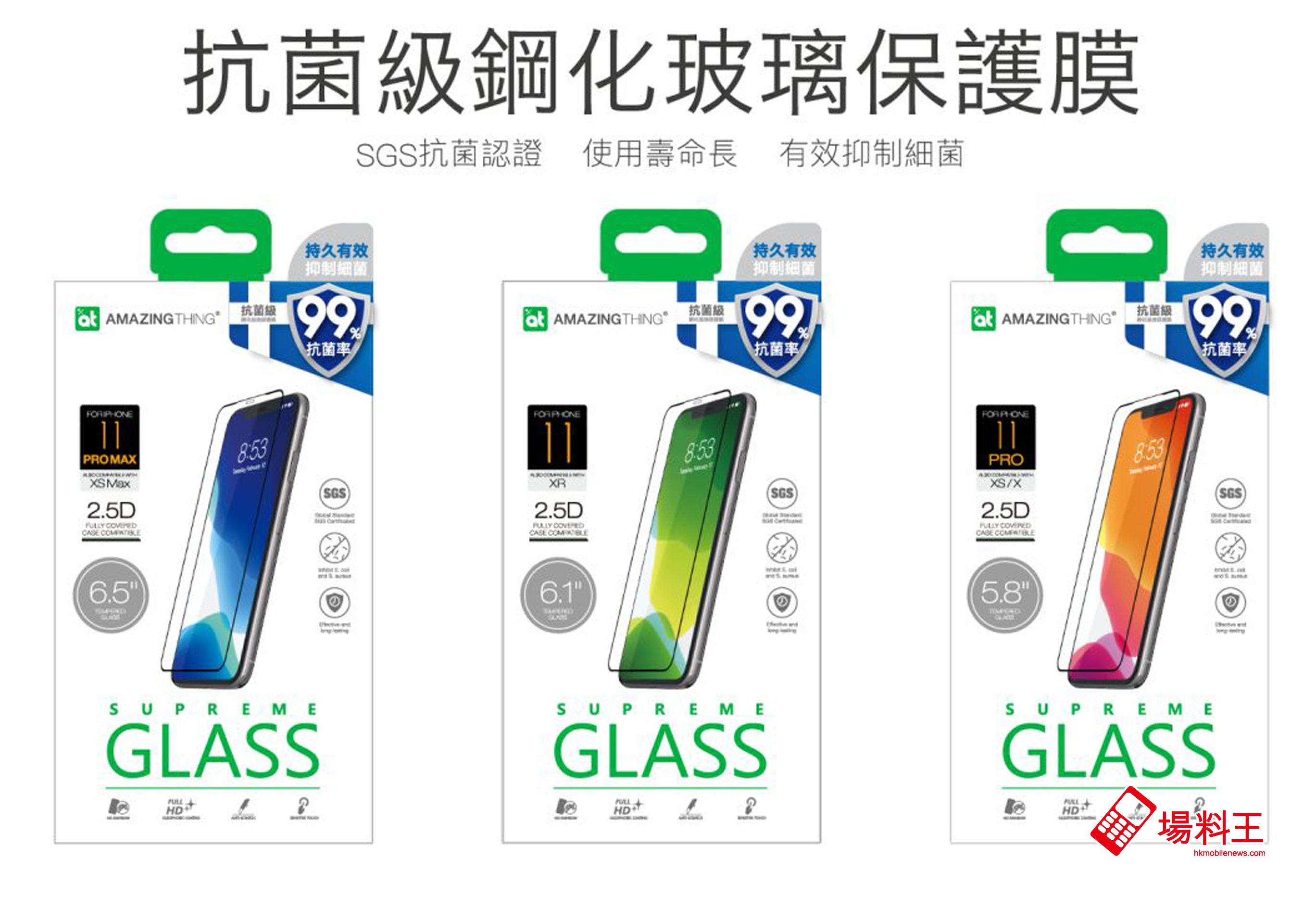 AMAZINGthing 抗菌級鋼化玻璃保護膜適用 iPhone 部分 5.8、6.1、6.5 吋屏幕的手機,型號包括:iPhone 11 / 11 Pro / 11 Pro Max / XS / XS Max / XR,建議零售價為 $198,現已上市。