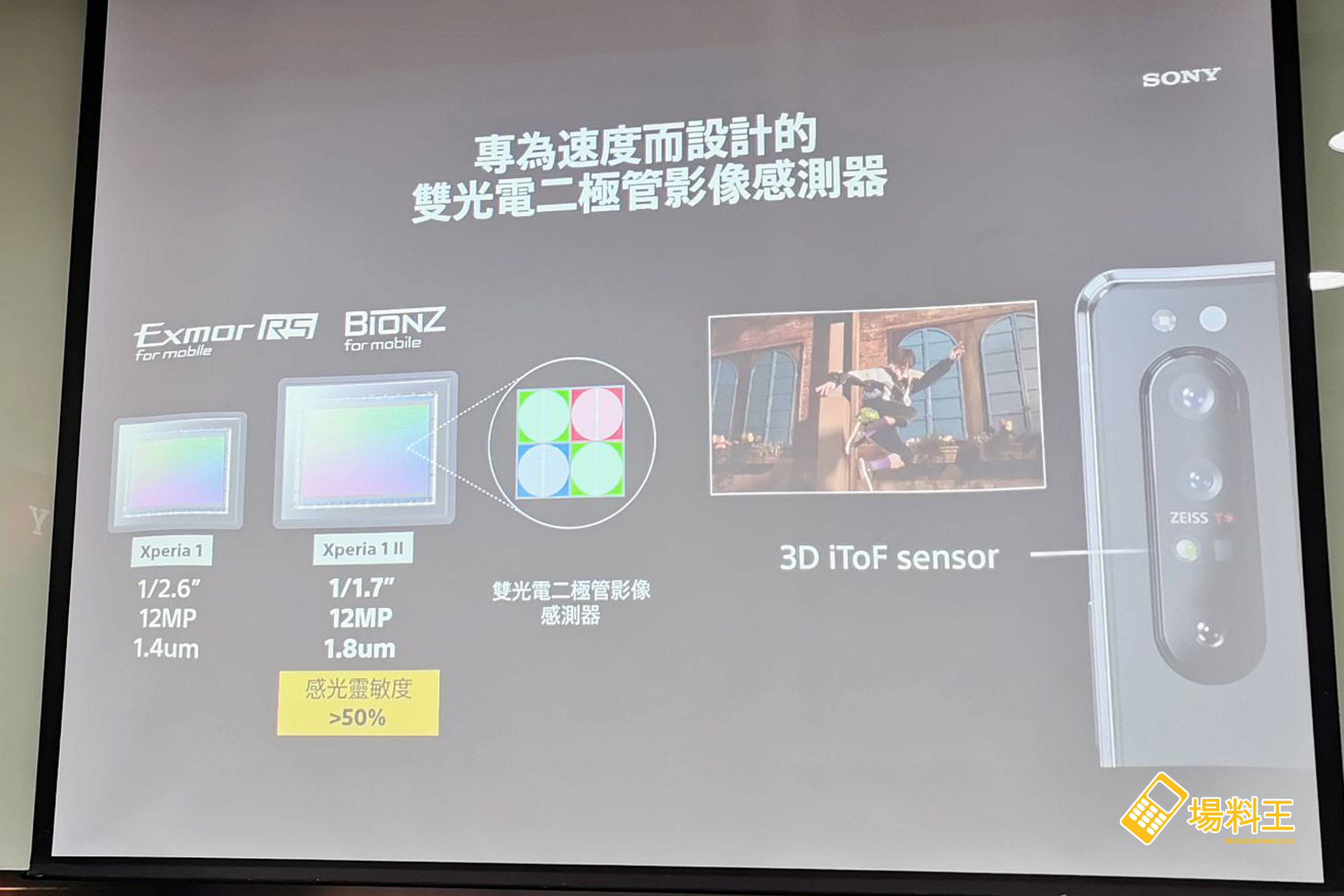 Xperia 1 II 的快速對焦功能亦可於昏暗的環境下使用,結合四項精湛影像技術,包括 Dual Photo Diode 感測器、覆蓋約 70% 感測器範圍的自動對焦系統、3D iToF 感測器及全新 1 / 1.7 吋「Exmor RS for mobile」特大影像感測器,令拍攝靈敏度比以往型號高 1.5 倍,即使在低光的環境下仍可快速及準確地對焦。
