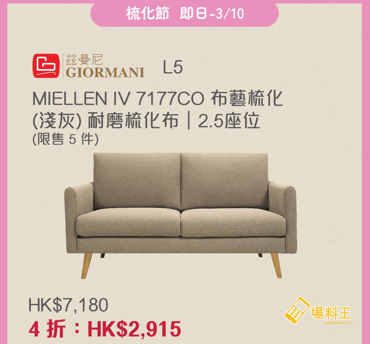 精彩優惠包括: AIRLAND 雅蘭 3D 舒適枕(1折:$29.9)、Kärcher 無線手提式吸塵機(1折:$320)、SimplyLife 開合餐枱(1折:$690)、Good Idea Deluxe 雅詩家居設計二座位電動梳化(日本寵物布)(1折:$799)、Sealy Hotel Paramount 床褥(1折:$2,568)、Built-in Pro Cimatech 高德 CFS308GB 22 公升二合一座檯式組合蒸焗爐(2折:$1,899)、GIORMANI 茲曼尼梳化 MIELLEN IV 布藝梳化(4折:$2,915/下圖)、Pricerite Pet Dogness 寵物噴泉式飲水機(5折:$200)、NITORI 指定衣櫃(5折:$1,495),MORRIS 寵物床低至 22 折等。