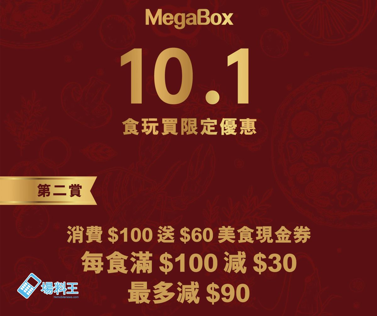 MegaBox 於 10 月 1 日推出一系列精彩優惠!只需在 MegaBox 的食肆及零售美食商戶消費滿 $100,即可獲得現金券或優惠券,包括 PHI COFFEE & PANCAKE 的飲品、樂拉麵的炸雞皮餃子、米泰的迷你春卷、太興現金券,以及 Kids Kids Car 的電動車券,還有百樂金宴的食品優惠券,送出過萬份禮品!此外,Mega Ice 也推出三大優惠:身份證號碼中連續含有「75」可享半價,包含「7」或「5」的號碼減 $10,10 月 1 日生日的朋友更可享免費溜冰,共慶佳節!