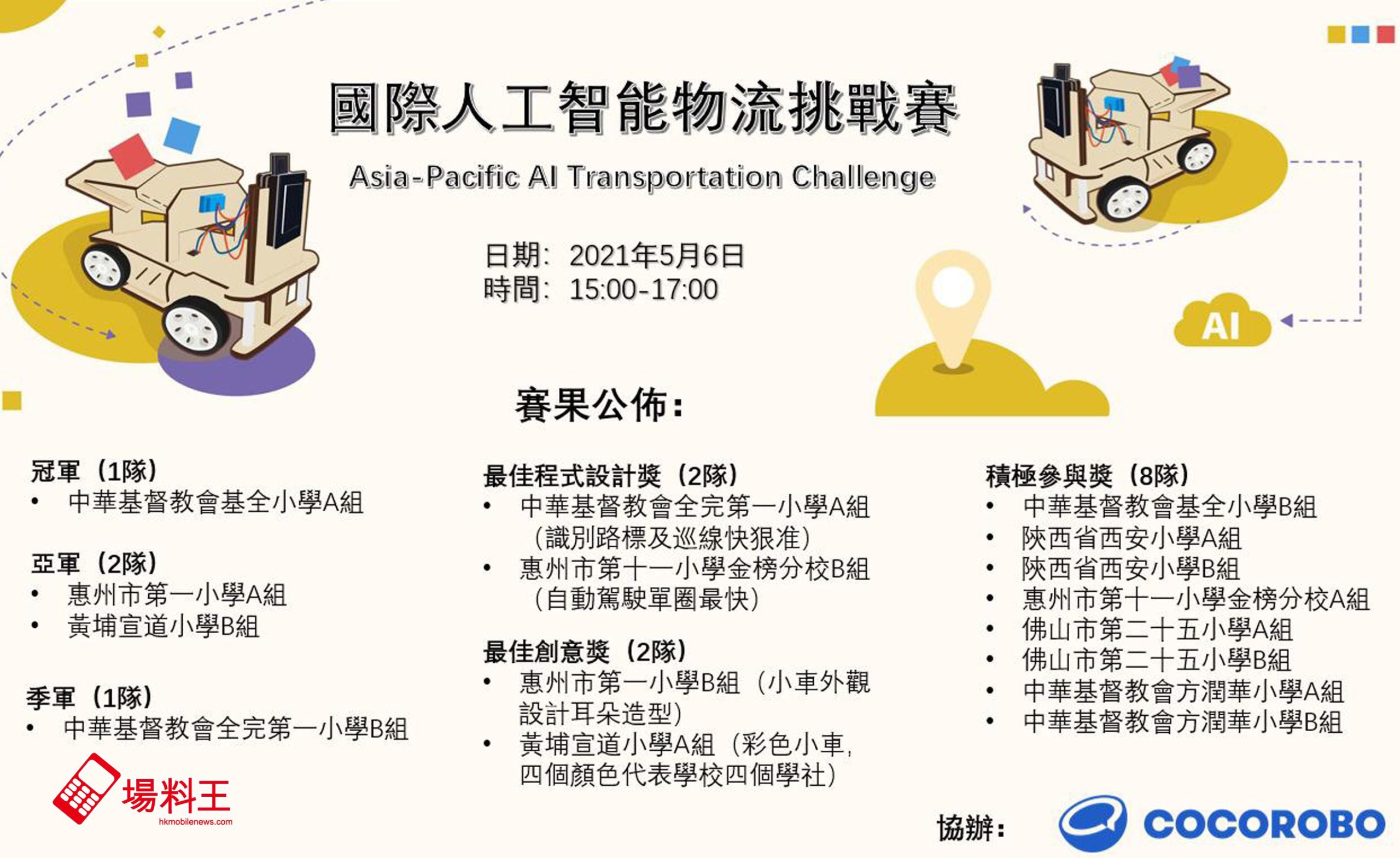 早於年初已籌辦的「國際人工智能物流挑戰賽」,在香港有 4 間小學參與,分別是黃埔宣道小學、中華基督教會方潤華小學、中華基督教會全完第一小學及中華基督教會基全小學,另於國內亦有 4 間小學參與,分別是陝西省西安小學、惠州市第一小學、惠州市第十一小學金榜分校、佛山市第二十五小學,以及新加坡 Fernvale Primary School,共 9 間小學,並經由 CocoRobo 協辦,讓各學校的份賽同學,在同一的物料的相同資源下,學習相關人工智能技術並製作一部自動駕駛物流小車,在規定時間內完成較多貨物運送任務為獲勝隊伍。參賽每校各派出 2 隊學生隊伍作賽;不過,由於新加坡政府方面的運送限制,致最後 Fernvale Primary School 未能作賽,實是可惜,而總參賽隊伍只有來自 8 間小學的 16 隊。