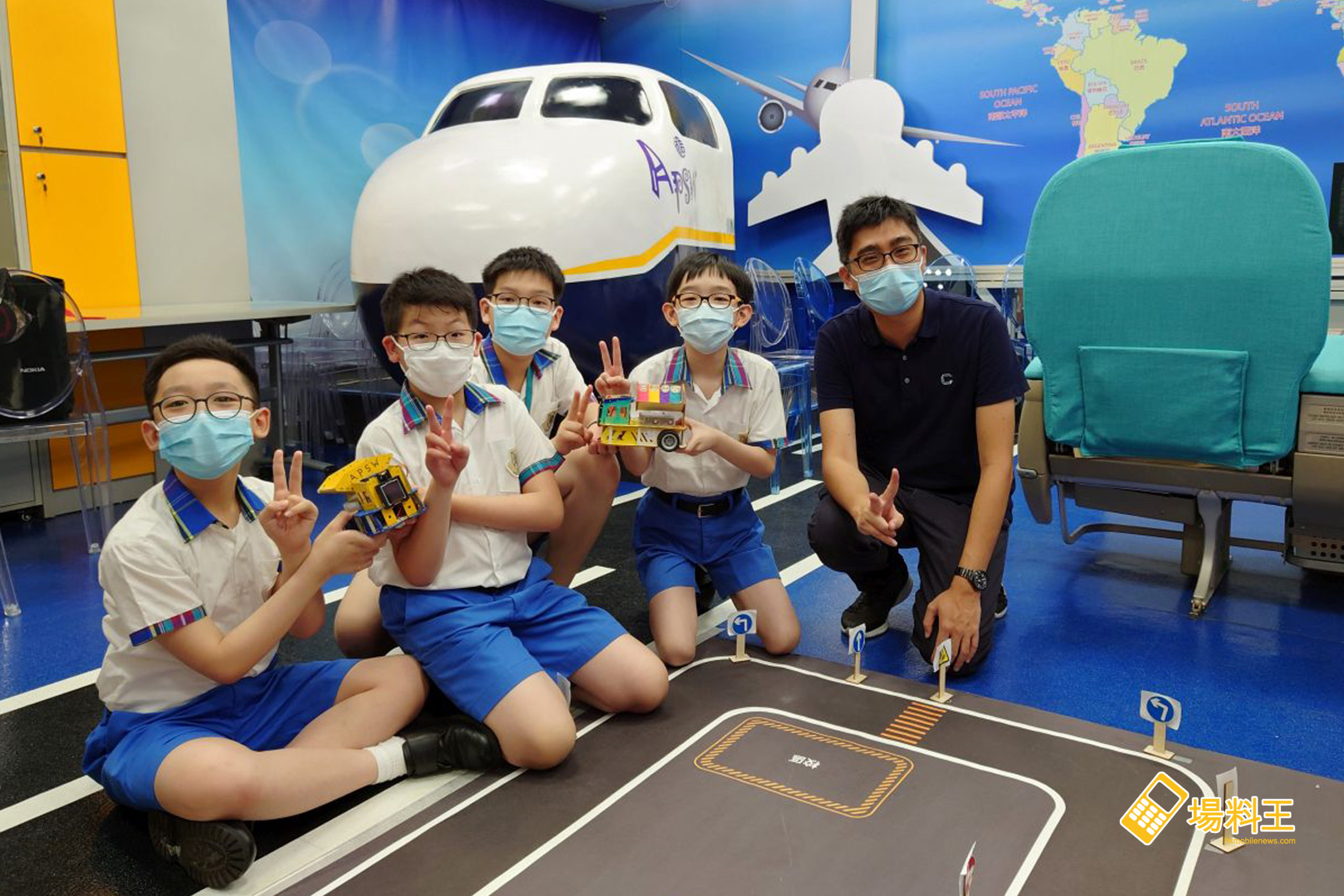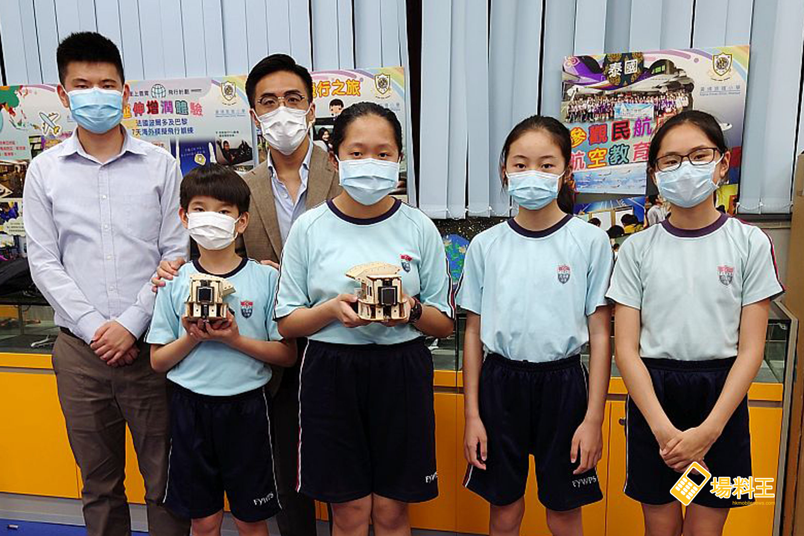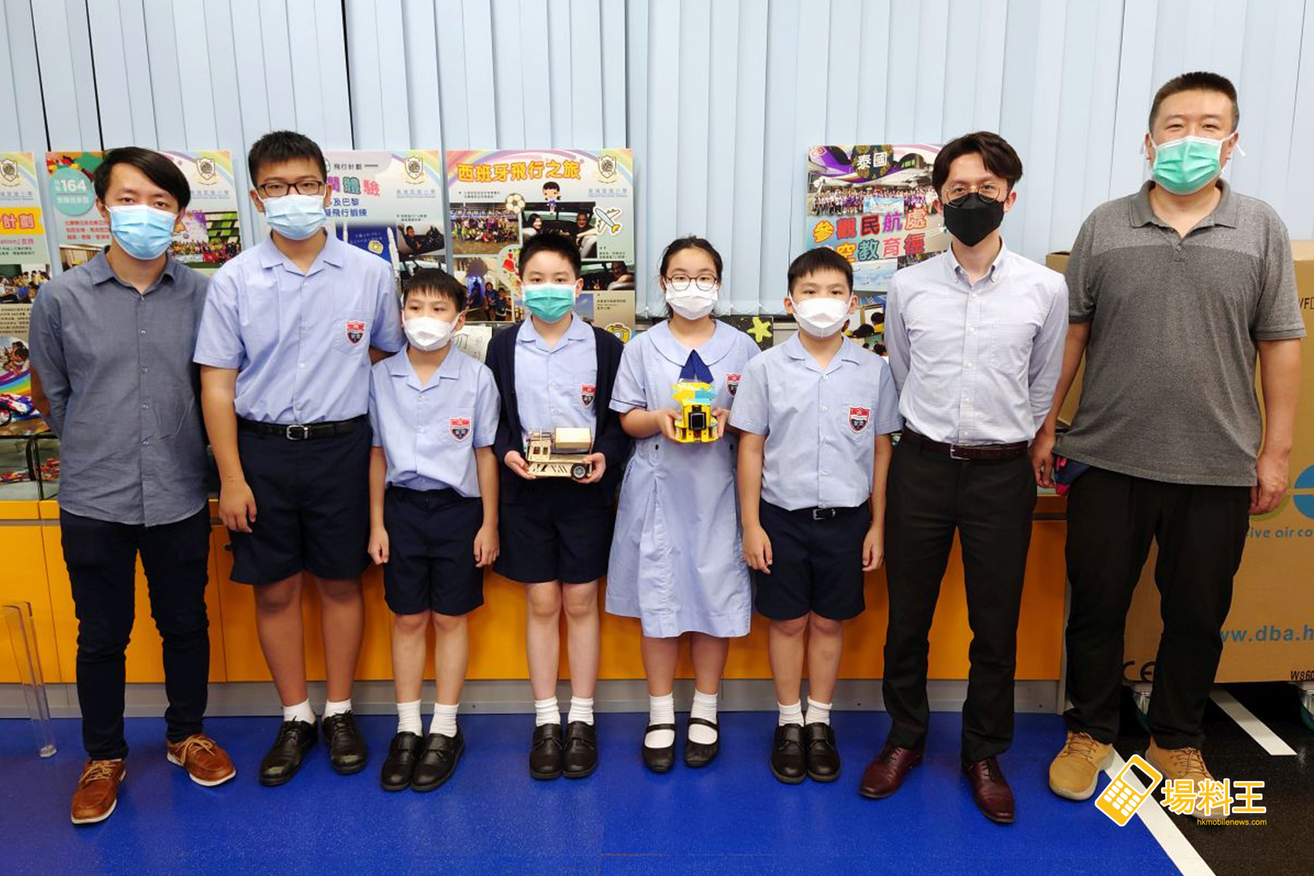 中華基督教會方潤華小學的兩隊同獲是次比賽的「積極參與獎」,帶隊的褚瑋濤老師(左一)、黃兆聲老師(左三)表示同學在課堂上有學過編程,不過對於製作及控制方面都算是新嘗試,隊員黃熙文(左二)、俞研澤(左三)、梁洛滋(右二)、陳凱晴(右一)則表示在編程學習以外,更要解決包括上螺絲等安裝上的步驟問題,也算是一個不錯的學習體驗。
