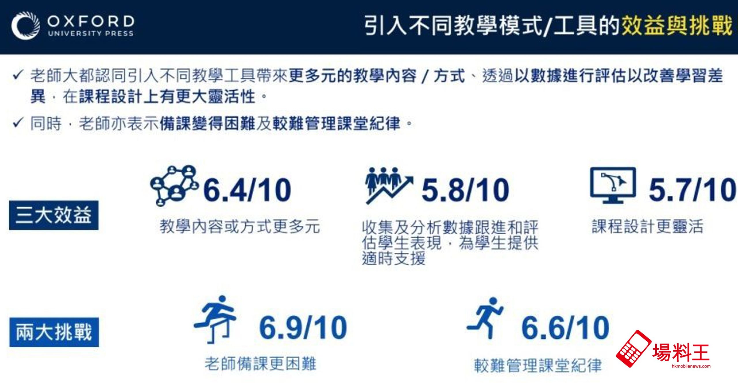 然而,引入不同教學模式或工具亦同時帶來挑戰,包括令老師備課更困難 (6.9分) 及較難管理課堂紀律 (6.6分)。