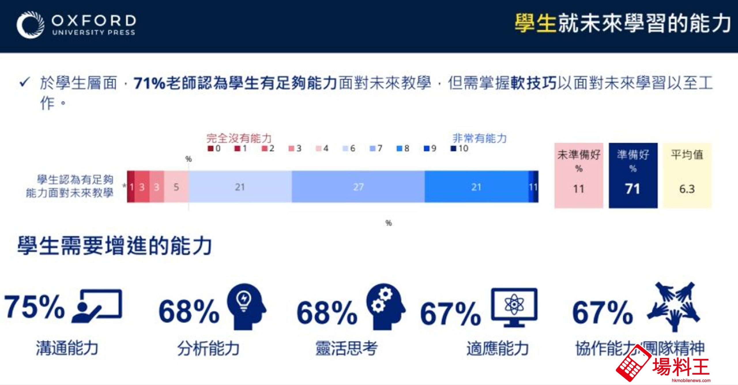同時,超過三份之二老師 (71%) 認為學生有足夠能力面對未來教學,然學生須開始掌握各種軟技巧以面對未來學習甚至工作需要,特別是溝通能力 (75%) 、分析能力 (68%)、靈活思考 (68%)、適應能力 (67%) 和協作能力及團隊精神 (67%)。