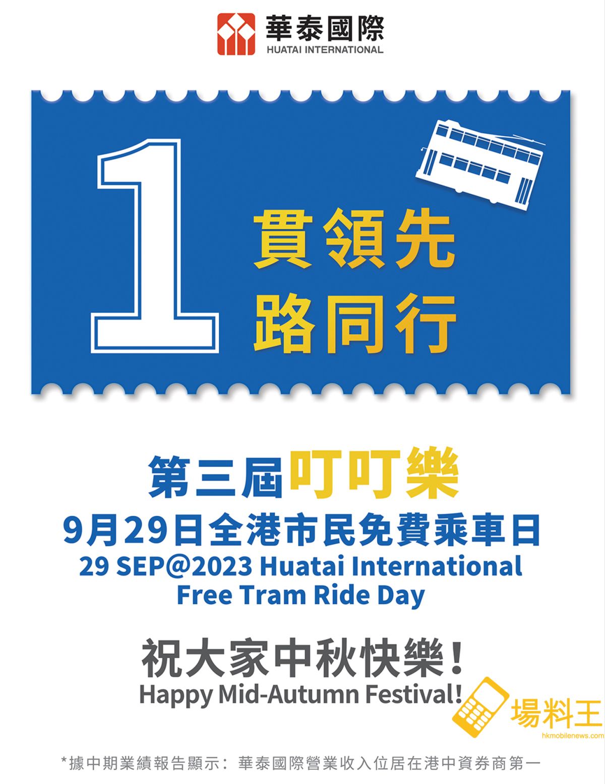 繼成功舉辦兩屆「叮叮樂」全港市民免費乘車日活動後,華泰國際金融控股有限公司(「華泰國際」)將於今年中秋節(2023年9月29日)舉辦第三屆「叮叮樂」全港市民免費乘車日活動,邀請全港市民於中秋節當日無限次免費乘搭電車遊港島,共享中秋團圓喜悅。