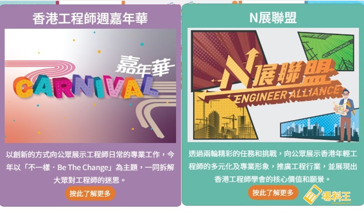 「香港工程師週嘉年華」是工程師週的重頭戲。嘉年華將於 3月 1日至 3 日,一連三天於西九文化區海濱草坪舉行。學會致力展示工程師行業的多樣性、創新性和重要性,安排多達 45 個互動攤位,讓公眾對工程行業有更深入的了解。嘉年華亦邀請 Per Se 等一眾歌手,為大家送上精彩的表演節目,是公眾週末放鬆玩樂的好去處。另外,為進一步向公眾展示香港年輕工程師的專業形象及更多面向,學會於今年舉辦首屆「N 展聯盟」,吸引眾多充滿活力的年輕工程師參與。參加者將透過兩輪緊張刺激的工程任務和挑戰,展現香港工程師的專業標準及卓越精神。