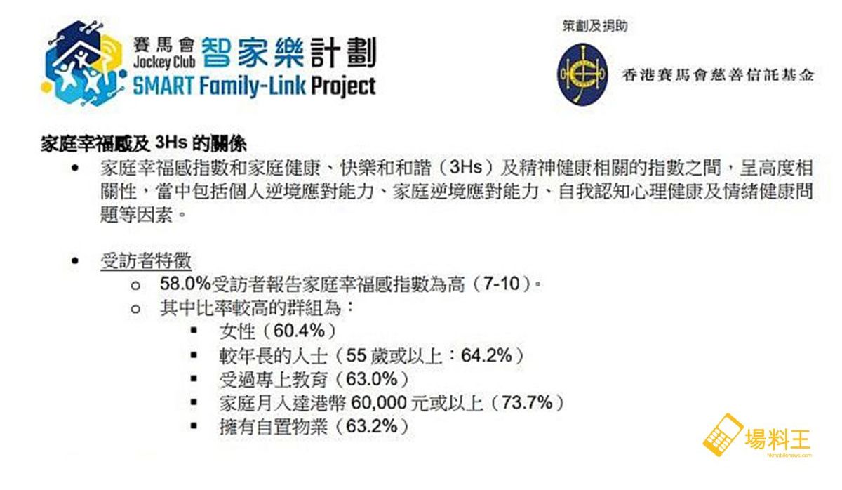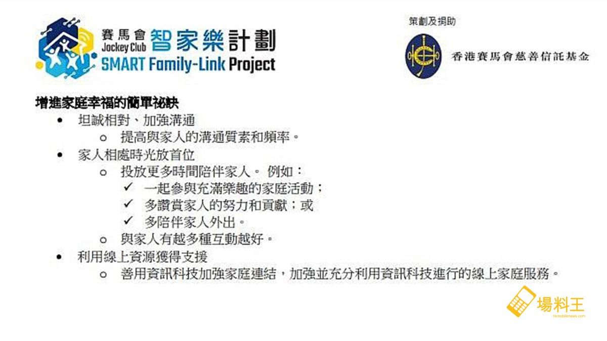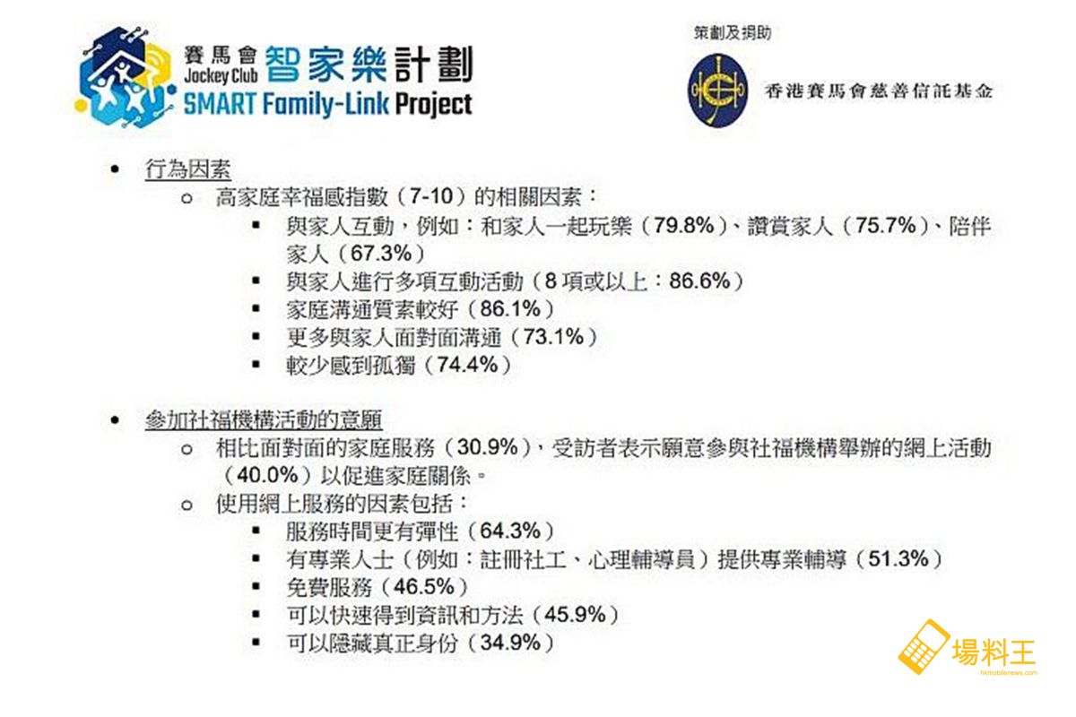「賽馬會智家樂計劃」由香港賽馬會慈善信託基金策劃及捐助,旨在利用資訊科技,協助非政府機構營運的綜合家庭服務中心及綜合服務中心提升家庭服務效能,鼓勵服務創新。疫情後,市民生活模式有不少改變,其中包括家庭的互動方式。為更深入了解港人疫後對家庭幸福感的看法,以及探討如何利用創新家庭服務模式以回應家庭的各種變化及需要,推廣正面積極的家庭生活,「賽馬會智家樂計劃」早前進行了一項名為「從疫情中恢復:家庭幸福感指數、其相關因素及創新家庭服務」的研究,以望有助締造更健康、快樂、和諧的家庭。