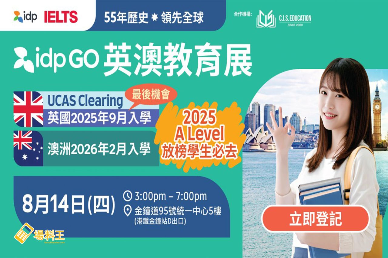 2025 年英國大學聯招(UCAS)現已進入最後補錄階段(UCAS Clearing)。在此關鍵時刻,英國大學將公布剩餘學額,並可能降低入學門檻,為尚未申請、未獲取錄或對現有 Offer 不滿意的學生提供最後衝刺的機會!立即報名參加,諮詢 IDP 專業顧問及院校代表,搶佔理想學位,開啟大家的英國升學之旅!同時,有意於下個學年赴英讀書的學生及其家長,亦可登記是次教育展,超前部署入讀醫療專科,趕及 2026 年 1 月份的申請期限。