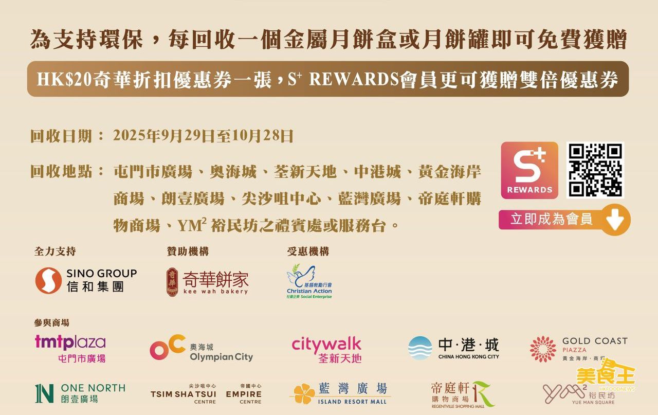 中秋佳節將至,奇華餅家與信和集團旗下商場今年再次合辦「中秋月餅罐回收計劃」,由即日至 10 月 28 日,把任何品牌金屬月餅罐交 10 個指定信和商場可獲贈奇華餅家折扣優惠券 $20。此活動在鼓勵市民於歡度節慶的同時,以實際行動支持環保,貫徹「循環再用,延續中秋美好」的理念,讓中秋的團圓意義延伸至對地球的關愛。
