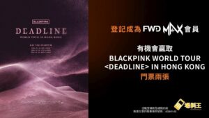 BLACKPINK 世界巡迴演唱會《DEADLINE》香港站將於 2026 年 1 月 24 至 26 日在啟德主場館舉行,由最初 2 場到加開 1 場的門票均火速售罄,全城瘋搶,一票難求!幸而 BLACKPINK 世界巡迴演唱會《DEADLINE》香港站的贊助夥伴 FWD 富衛保險,特別預留了 60 張演唱會門票送給 FWD MAX 會員,所有人均可登記成為 FWD MAX 會員,免費參加抽獎贏取門票 2 張!
