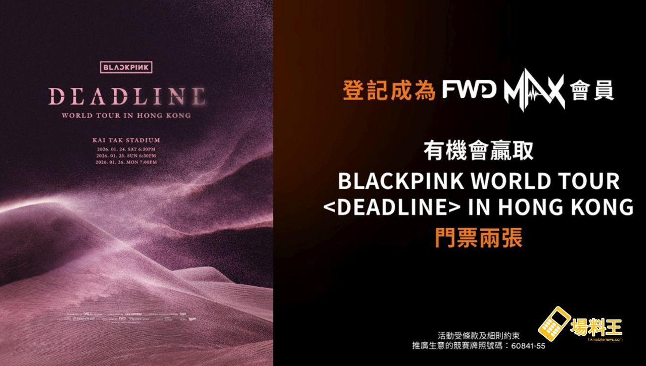 BLACKPINK 世界巡迴演唱會《DEADLINE》香港站將於 2026 年 1 月 24 至 26 日在啟德主場館舉行,由最初 2 場到加開 1 場的門票均火速售罄,全城瘋搶,一票難求!幸而 BLACKPINK 世界巡迴演唱會《DEADLINE》香港站的贊助夥伴 FWD 富衛保險,特別預留了 60 張演唱會門票送給 FWD MAX 會員,所有人均可登記成為 FWD MAX 會員,免費參加抽獎贏取門票 2 張!