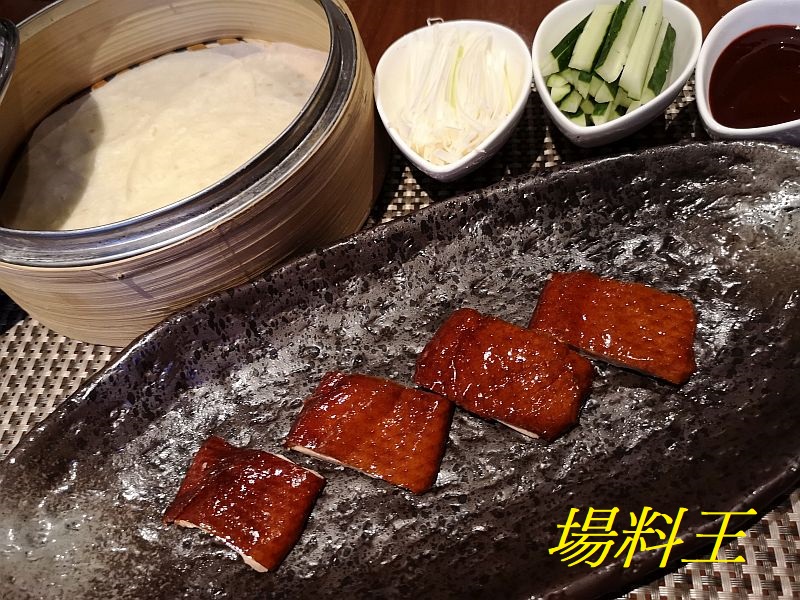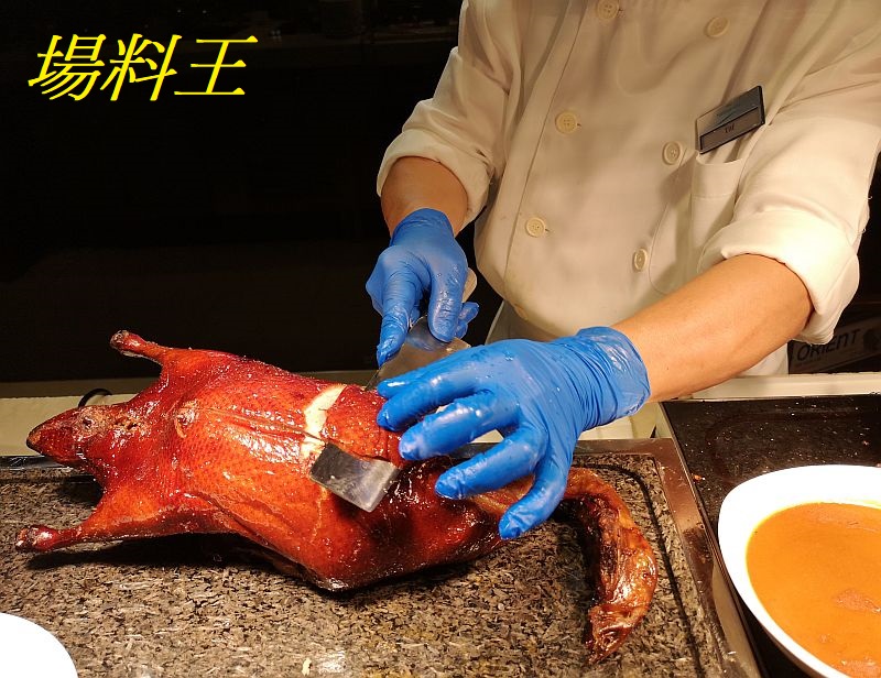 灣景廳的自助晚餐不時都會加入新菜式,為食客帶來新鮮感,而除了先前介紹的「香麻拌貢菜」(綠色)、「陳醋小雲耳」等醒胃前菜外,今次主廚亦把北京片皮鴨以即席切片供大家享用。