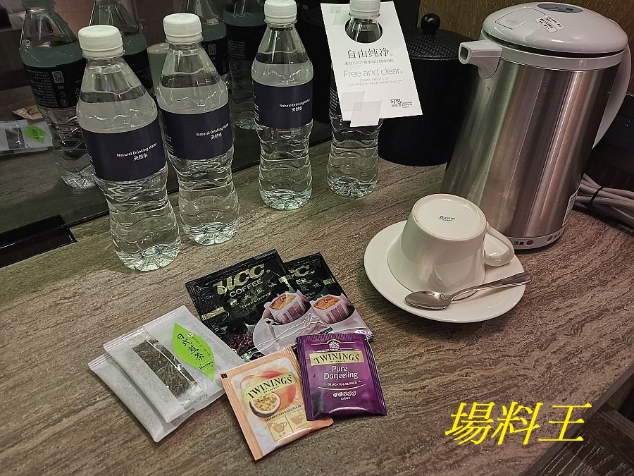 在小型電熱水壺外,咖啡、綠茶、英式茶包都已為大家預備,而更貼心的是支裝水亦提供 4 瓶之多,在炎夏之時,或是對於經常飲水的筆者,就最是受落。