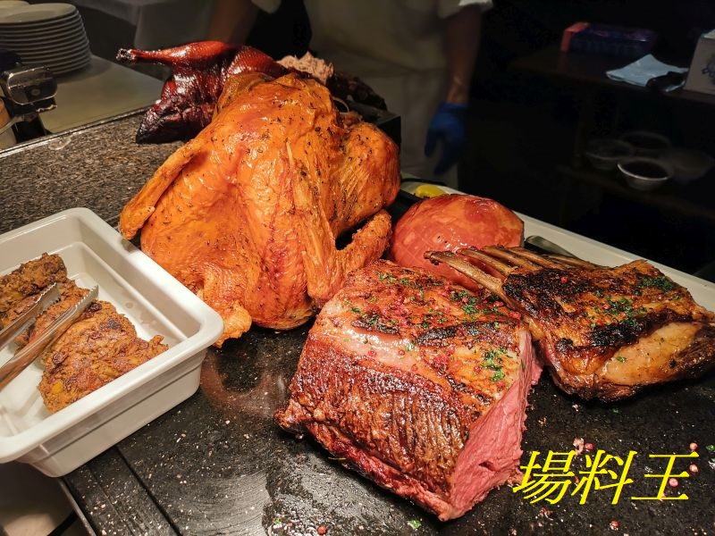 燒烤區除了提供西冷牛扒、燒羊架、燒鵝等外,因時近聖誕,故餐廳更加設了原隻火鷄及蜜糖芥末燒聖誕有骨火腿。
