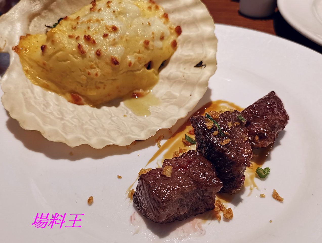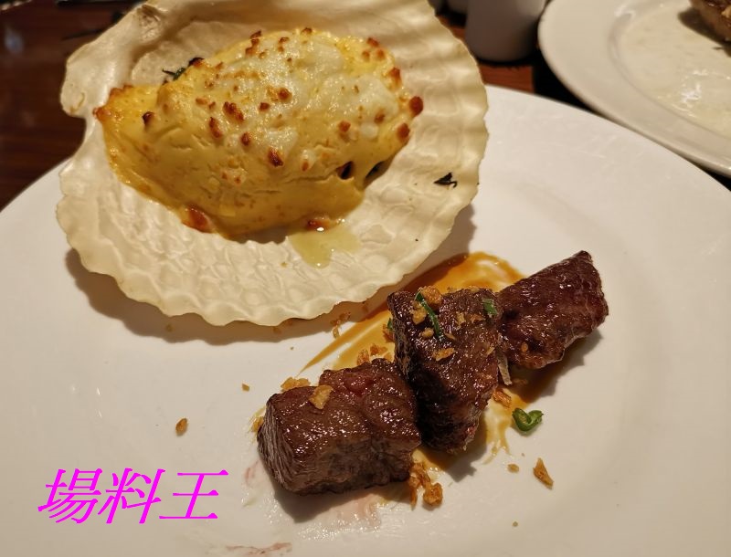 灣景廳的自助晚餐,每次都有一道特選限定菜式送每位食客的,今次選來的是「香蒜和牛配海膽焗珍寶元貝」,當中的和牛特選每頭和牛只有 2 至 3 公斤的「牛肩胛」稀有部位,因其脂肪豐富,肌肉纖維明顯,加入海鹽及蒜蓉煎至外香內嫩,入口嫩滑且帶濃郁牛香的富豐肉汁,正!而體積超大的日本珍寶元貝,以自製的海膽芝士醬焗至金黃,帶出鮮甜甘香,跟和牛同吃更是匹配!