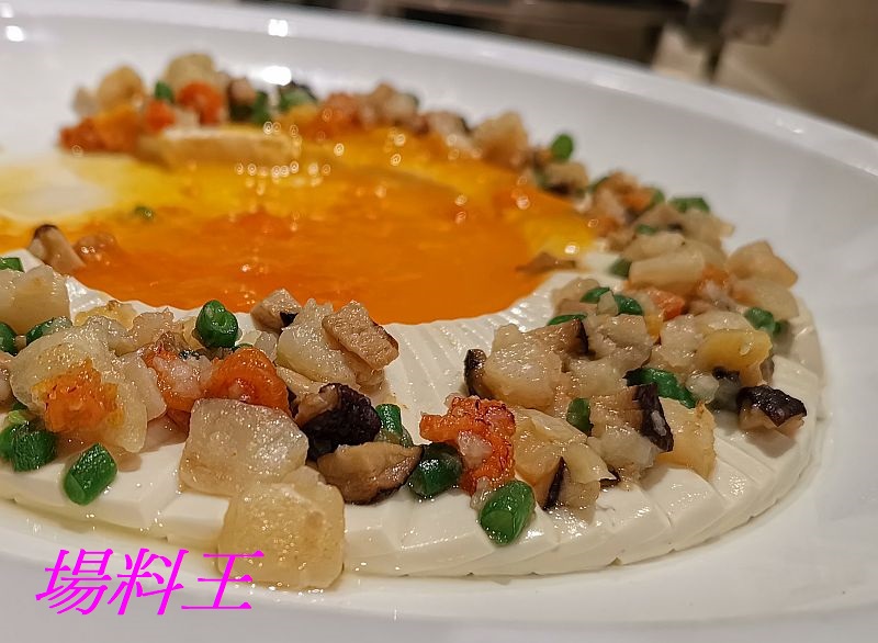 經巧斧神工的刀法切成的豆腐薄片,格外嬌嫩細緻,配合炒香的珊瑚蚌、貴妃蚌、鮮蝦及蜜豆等豐富食材,口感爽滑豐富,加上用韓國新鮮海膽及上湯煮成的橙黃芡汁,令「海膽海皇蒸千葉豆腐」即成色香味俱備的佳餚。
