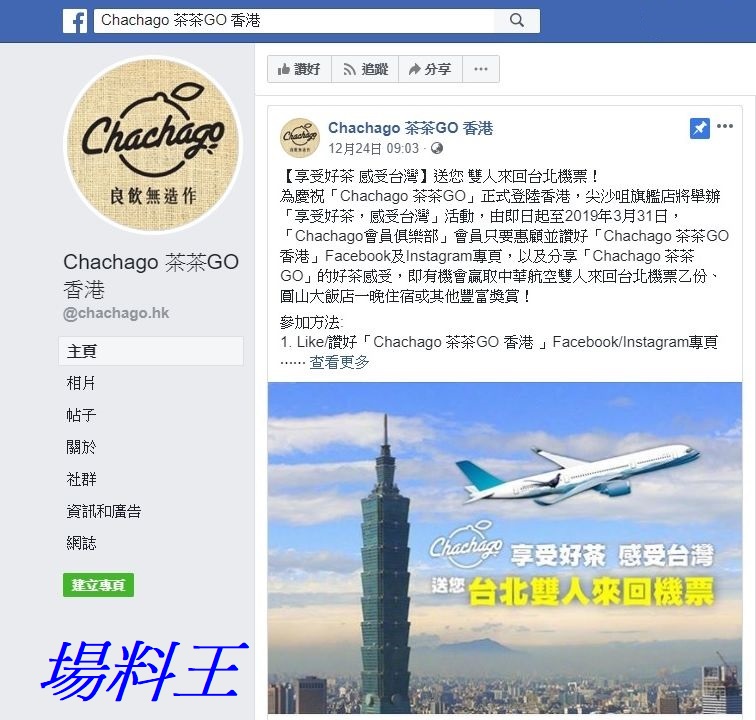 為慶祝「Chachago 茶茶 GO」正式登陸香港,尖沙咀旗艦店將舉辦「享受好茶,感受台灣」活動,由即日到 2019 年 3 月 31 日,顧客只要惠顧時讚好「Chachago 茶茶 GO 香港」Facebook 及 Instagram 專頁,以及分享「Chachago 茶茶 GO」的好茶感受,即有機會贏取中華航空雙人來回台北機票乙份、圓山大飯店一晚住宿或其他豐富獎賞,詳情請留意「Chachago 茶茶GO」香港官方網站公佈。