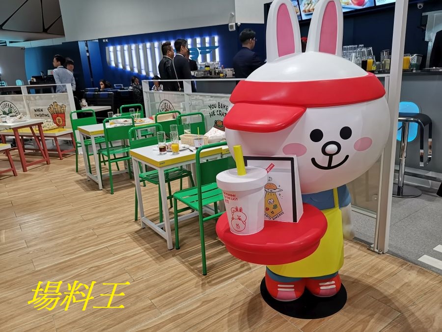 相信有到過 Line 專門店的,都知道每店外都有一個巨型的 Mega Brown 公仔供大家拍照,而今次於機場 Cafe 門外的,更是全球首個以手持漢堡包造型設計的 Mega Brown,暫時僅此一家提供!在 Mega Brown 旁更有戴上廚師帽的 Sally,確是可愛。