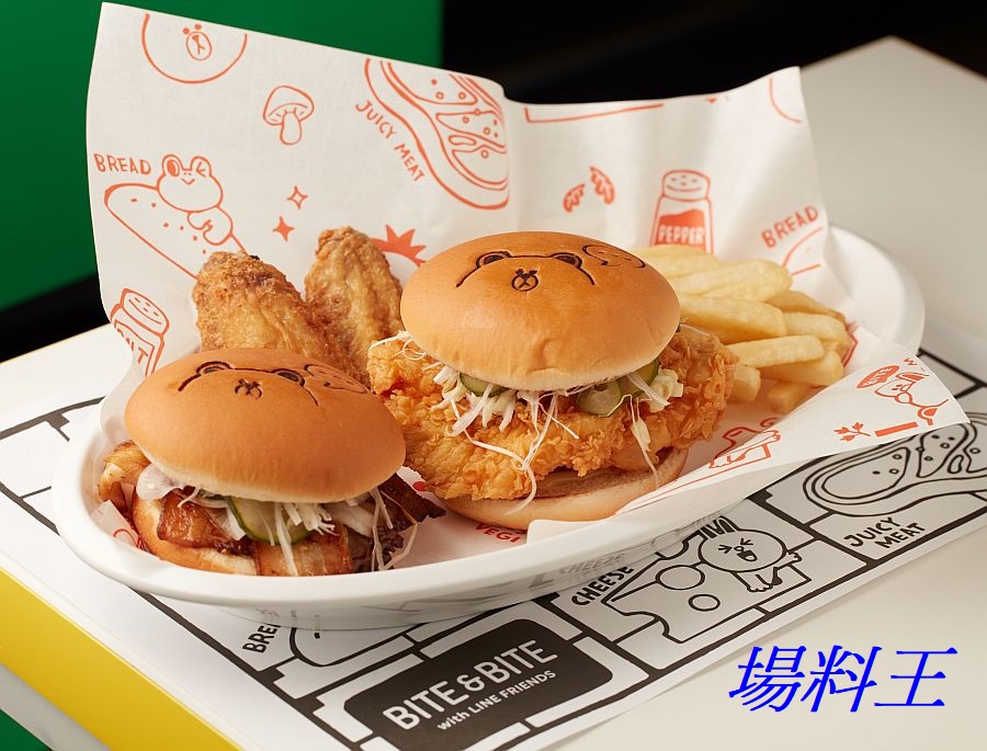 主食方面,餐廳以傳統韓式醬汁,配合燒雞、芝士牛肉、烤豬肉、魚或蝦等不同食材,推出 9 款美味 Bite 漢堡,分別為香脆雞扒漢堡 (下圖右)、脆辣雞扒漢堡、烤雞扒漢堡、辣烤雞扒漢堡、烤豬肉漢堡 (下圖左)、辣烤豬肉漢堡、炸蝦餅漢堡、炸魚柳漢堡,各配上炸薯條售價同為 $78,另有芝士牛肉漢堡配炸薯條,售 $88。較特別的,是在漢堡包上面會有 Brown 或其他 Line Friends 的烙印圖案,不過這圖案是隨機印上而不能揀選的。