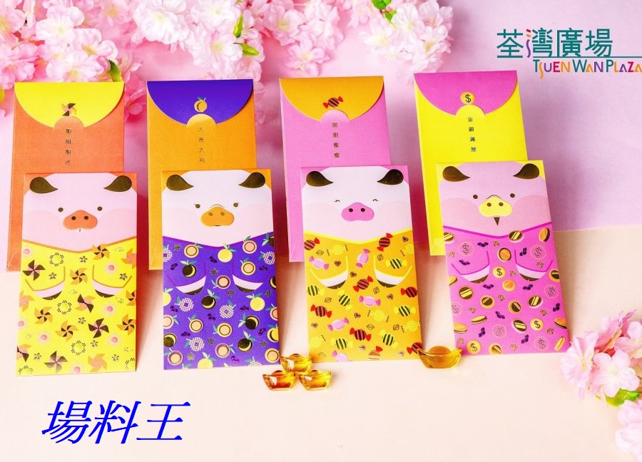 為求新年好運傳開,荃灣廣場為大家準備了一套 4 款「豬肥屋潤」利是封,配以不同款式的新年服裝及賀年吉祥飾物,送上最「啱聽」的新春祝賀語,再配以大膽創新的顏色,大家只須於荃灣廣場消費滿指定金額或憑 TWP VIP Club 會員指定積分便可免費換領。