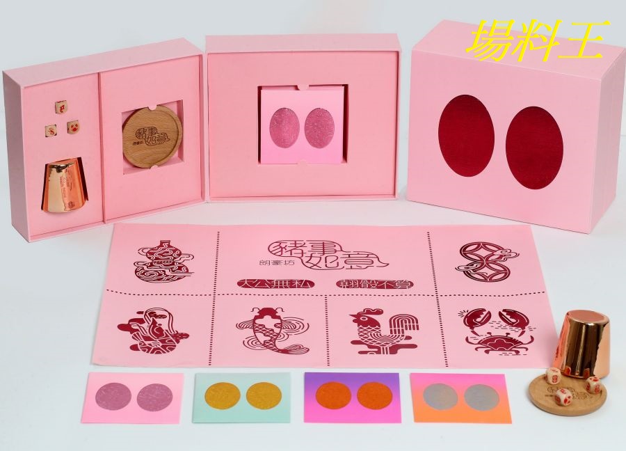 除利是封外,Box Set 內藏過年必玩的魚蝦蟹遊戲套裝,玩法與傳統「魚蝦蟹」無異,但造型設計絕對驚喜滿分!粉紅色遊戲紙上印有獨特風格的魚、蝦、蟹、金錢、葫蘆及公雞插畫,為懷舊的「魚蝦蟹」增添時代感;套裝亦附設木製骰子及骰盤,以及玫瑰金骰盅,即時升「格」十倍!新正頭找齊各方親朋好友熱鬧玩一番,新年齊齊「豬」籠入水!