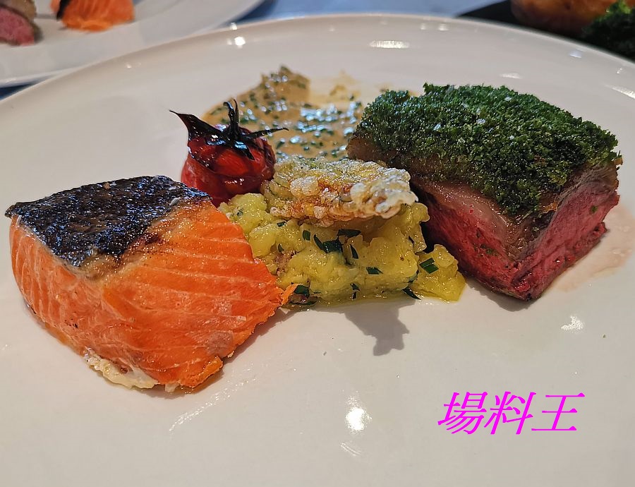 4 款主菜中筆者試吃了烤西班牙黑毛豬肉拼加利西亞八爪魚 ($480 / 上圖)、烤焗草飼英國羊柳拼皇帝三文魚 ($420 / 下圖),前者黑毛豬肉味道香濃軟腍有口感,後者的羊柳入口鮮嫩沒甚膻味,皇帝三文魚的魚皮煎至甘香也很惹味;其他 2 款則主菜為香煎法國雞胸肉拼北海道帶子 ($380)、慢煮意大利小牛肉架拼烤海藍蝦 ($450),全是各選海、陸食材各一款來作配合,感覺新鮮。當然,餐廳的招牌龍蝦濃湯 ($210)、原隻波士頓龍蝦 ($599) 以至多款麵包,也都保持高水準的味道,絕不令人失望。